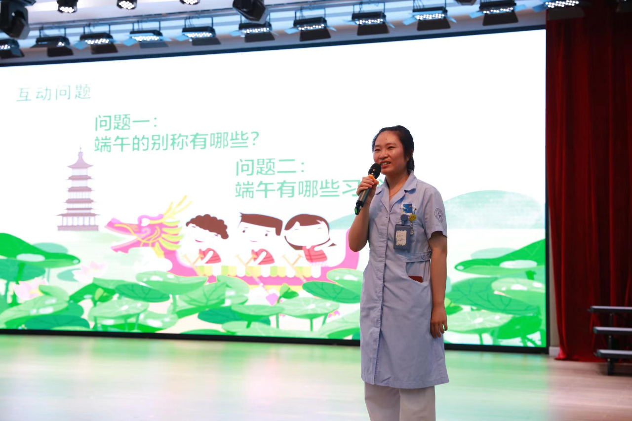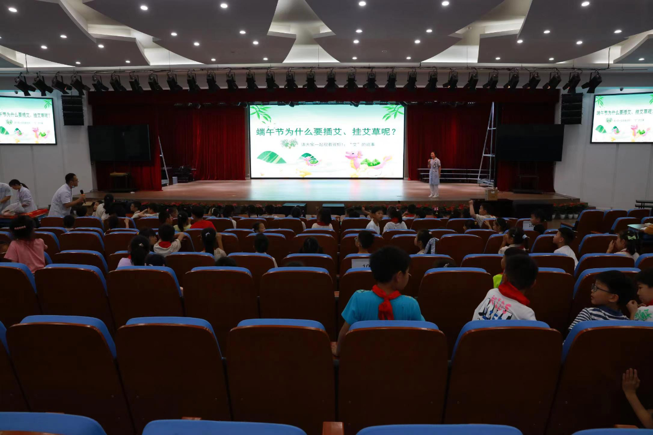 活动现场,护士朱金莉通过PPT向大家讲解了端午的由来与习俗、艾草的功效、护眼保健、日常生活里的中医养生智慧等内容,来自中药房的冯婉红主任向孩子们介绍了各种中药的形态、作用。蜈蚣、鳖甲、蝉蜕……孩子们既兴奋又好奇,问题一个接一个,上演了一场别开生面的中医药文化课。