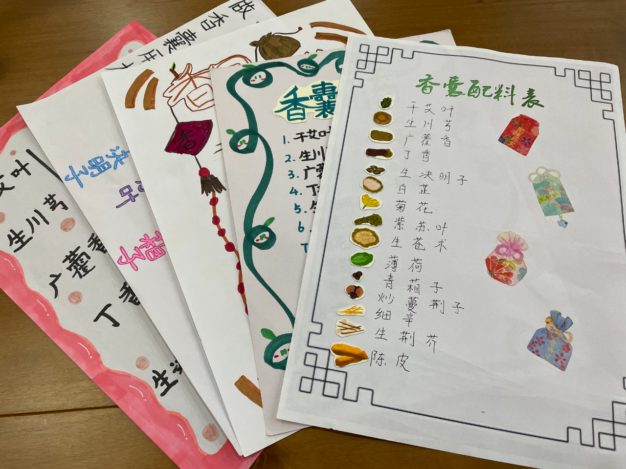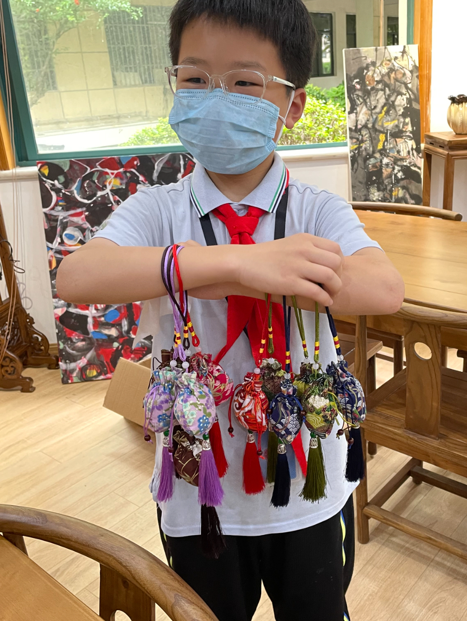 手中的香囊不时散发着浓郁的气味,同学们将亲手制作的香囊赠予老师,送给家人,也把端午的祝福锁在了这小小的香囊中。