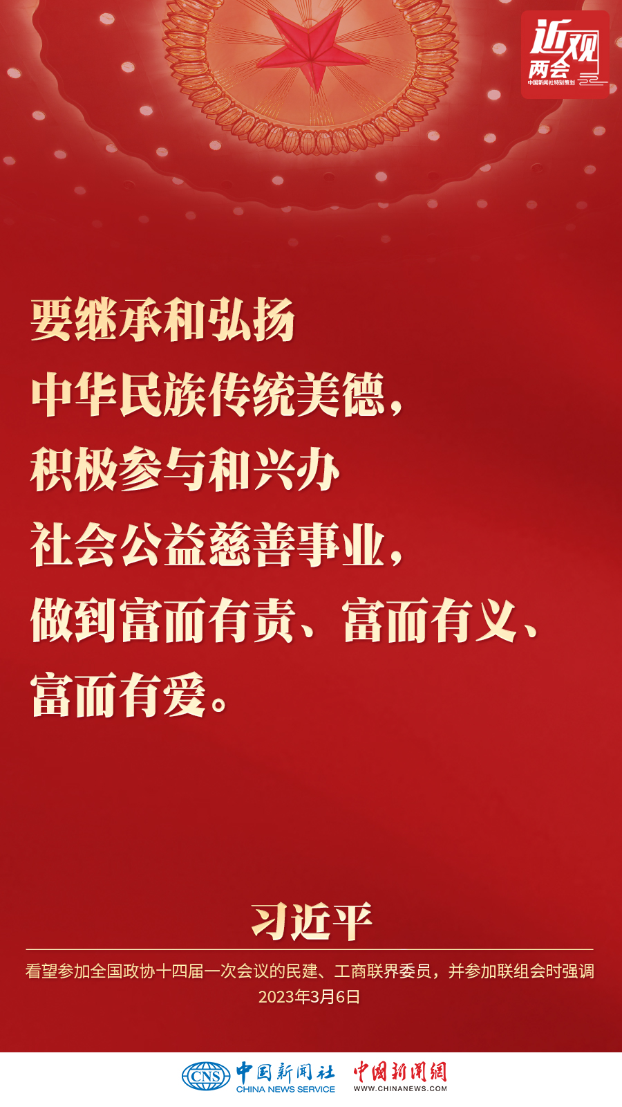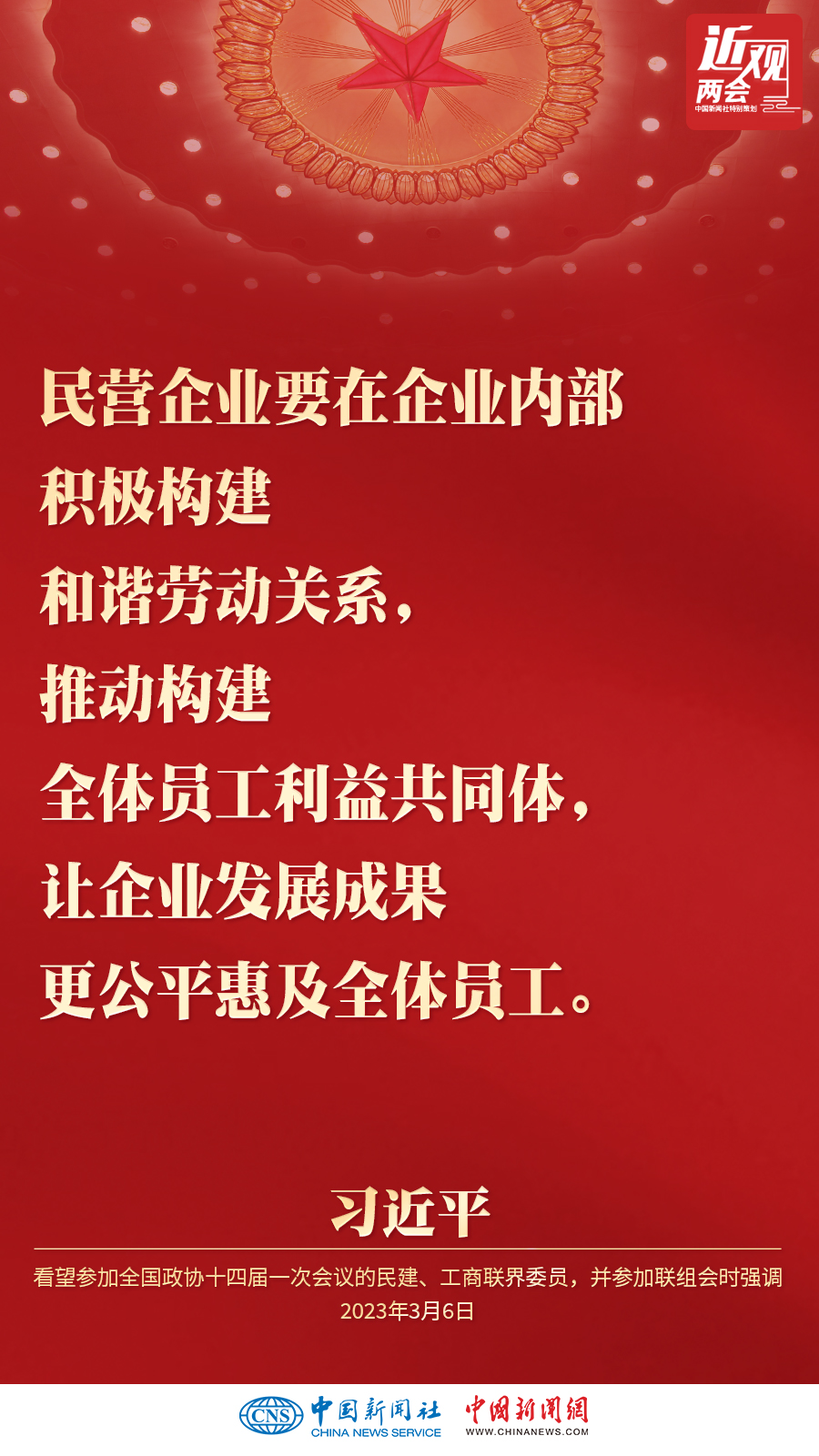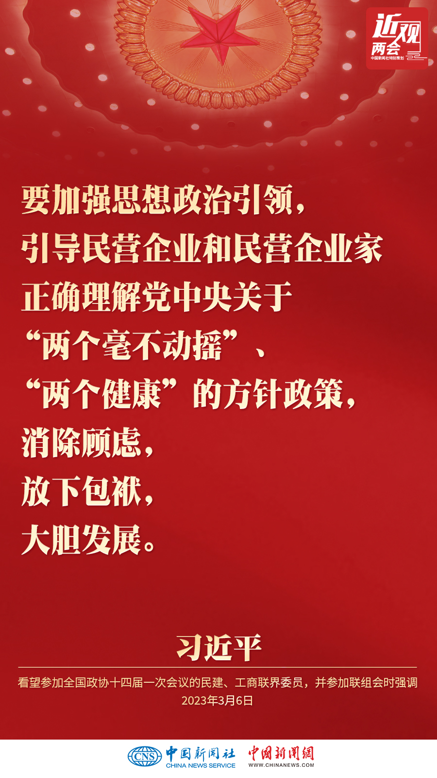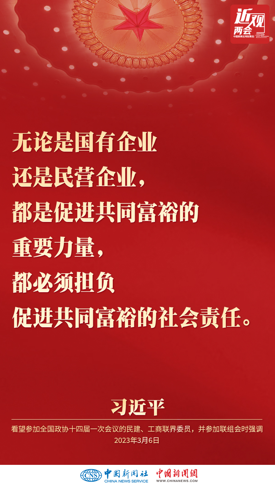中共中央总书记、国家主席、中央军委主席习近平3月6日下午看望了参加全国政协十四届一次会议的民建、工商联界委员,并参加联组会,听取意见和建议。他强调——
