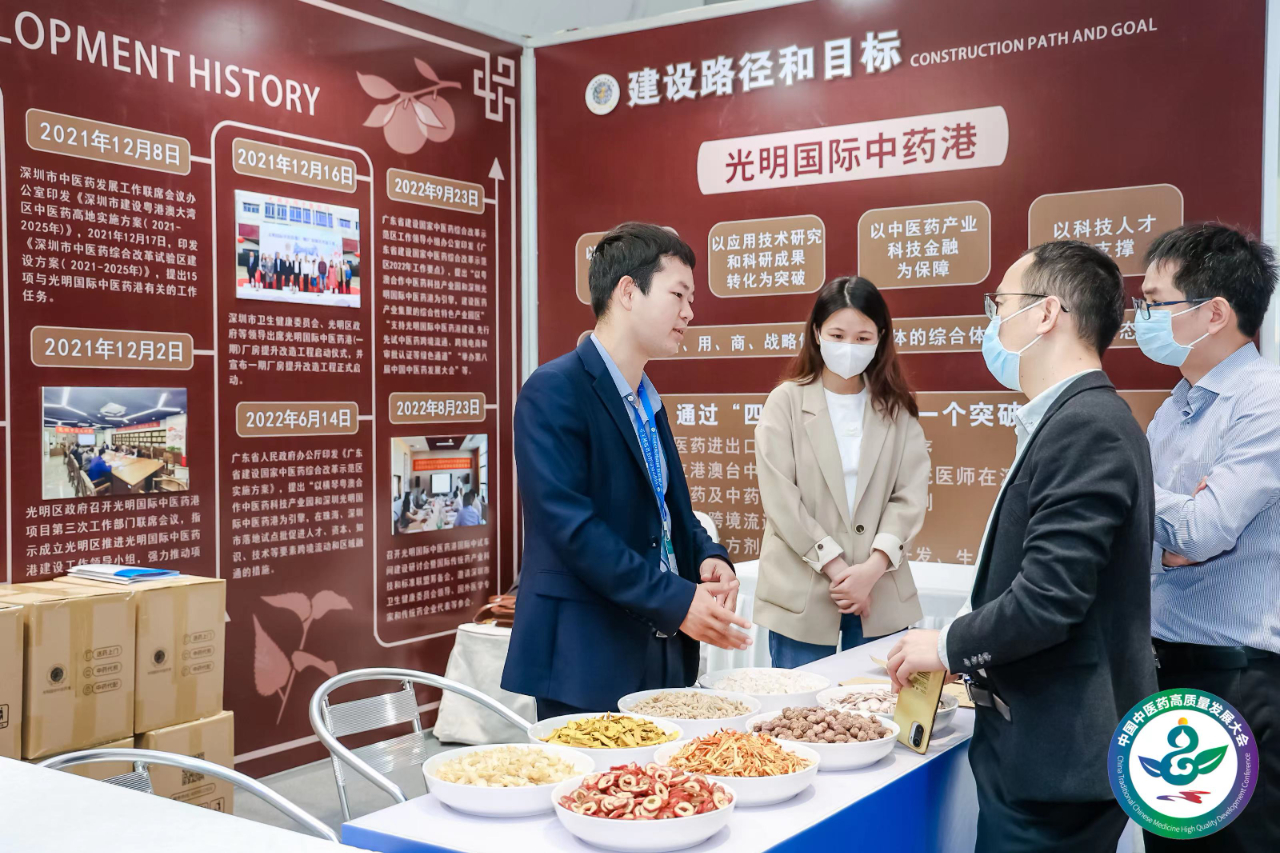 参会嘉宾在光明国际中药港展位前参观交流