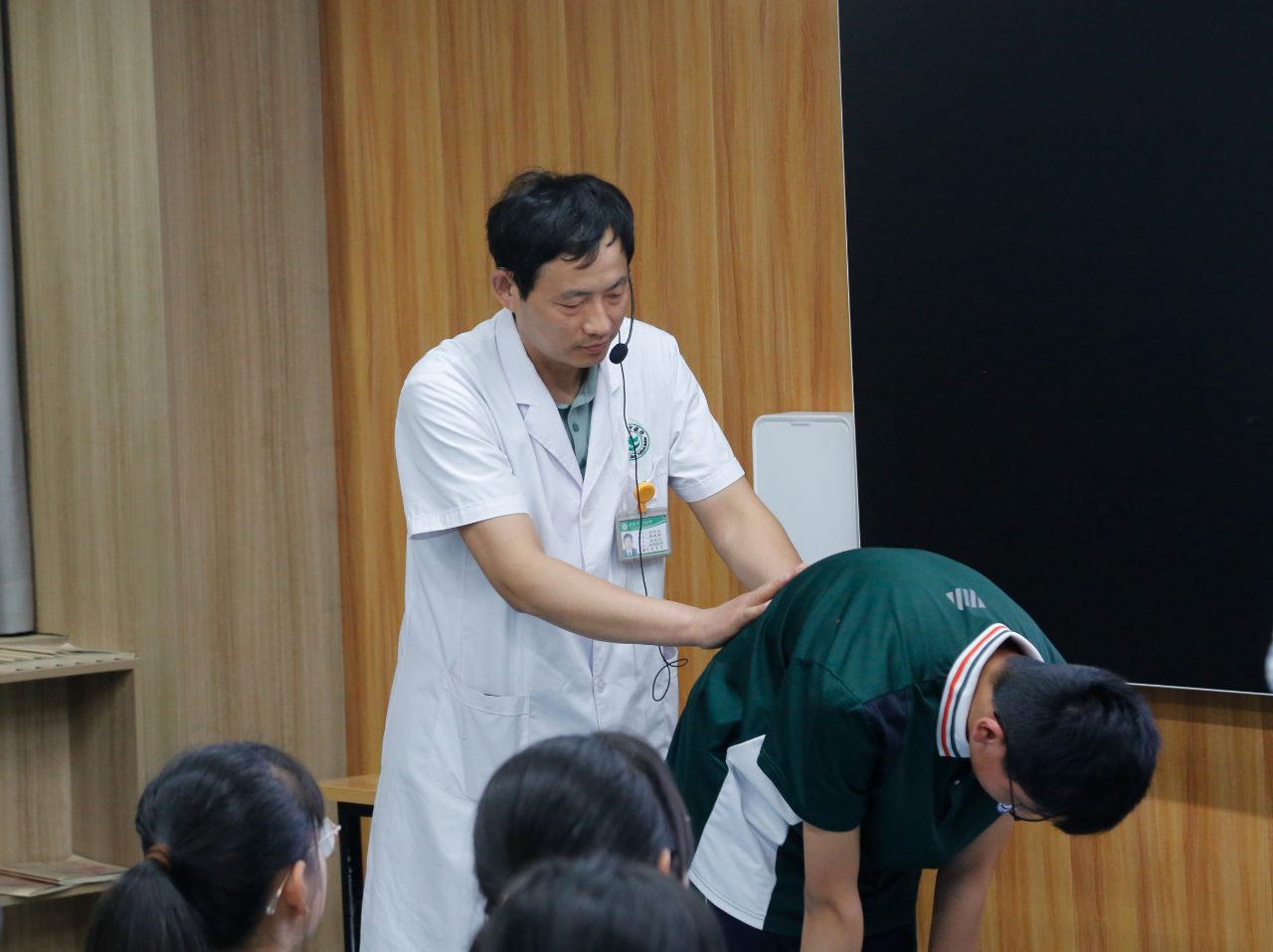 接着引导同学们认识什么是脊柱侧弯、造成脊柱侧弯的原因和危害。并现场互动,通过六步筛查法,辨别是否有脊柱侧弯,同时从日常站姿、坐姿、卧姿、锻炼及饮食等方面讲解了防治脊柱侧弯的科普知识。
