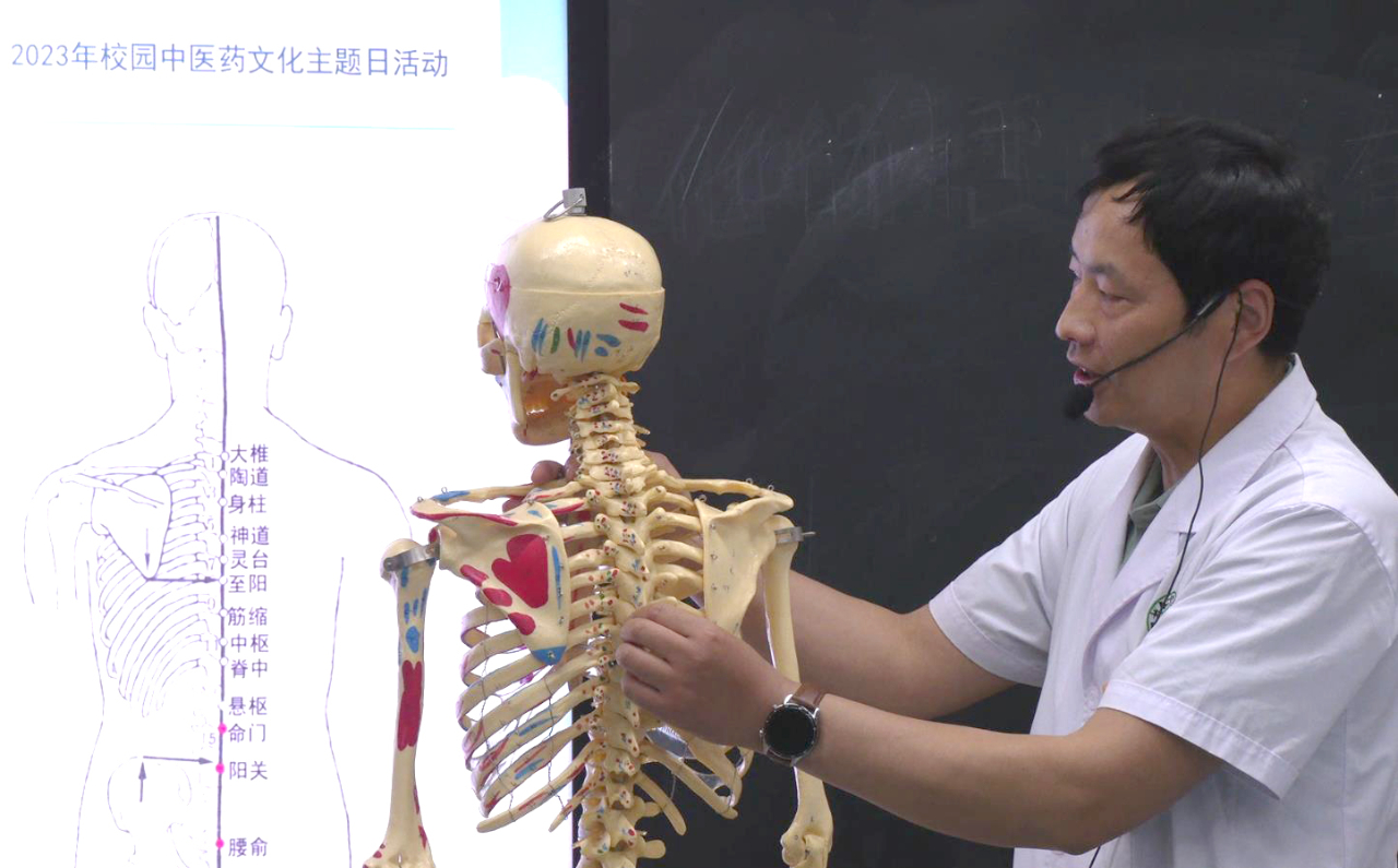 活动中,新泰市中医医院康复科主任翟树地通过形象的图片、有趣的动画视频、人体骨骼模型等向同学们介绍了脊柱、脊柱的的作用及常见的脊柱相关疾病。