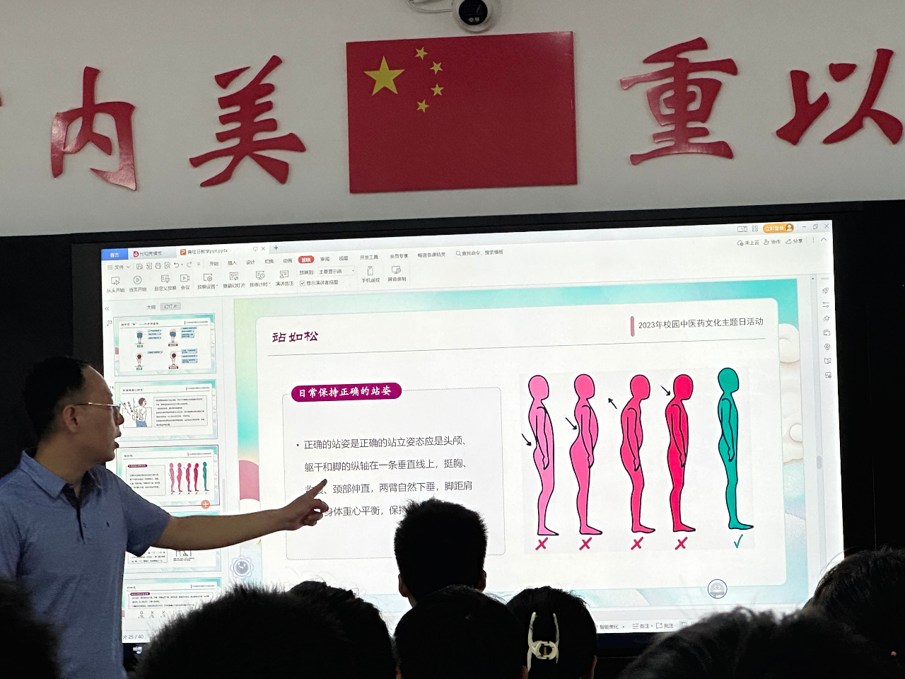 二、通过医护人员现场指导, 组织学生练习中医药传统养生功法,对脊柱进行有效的锻炼。