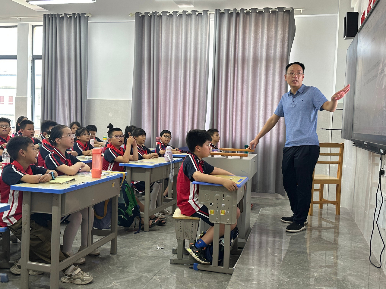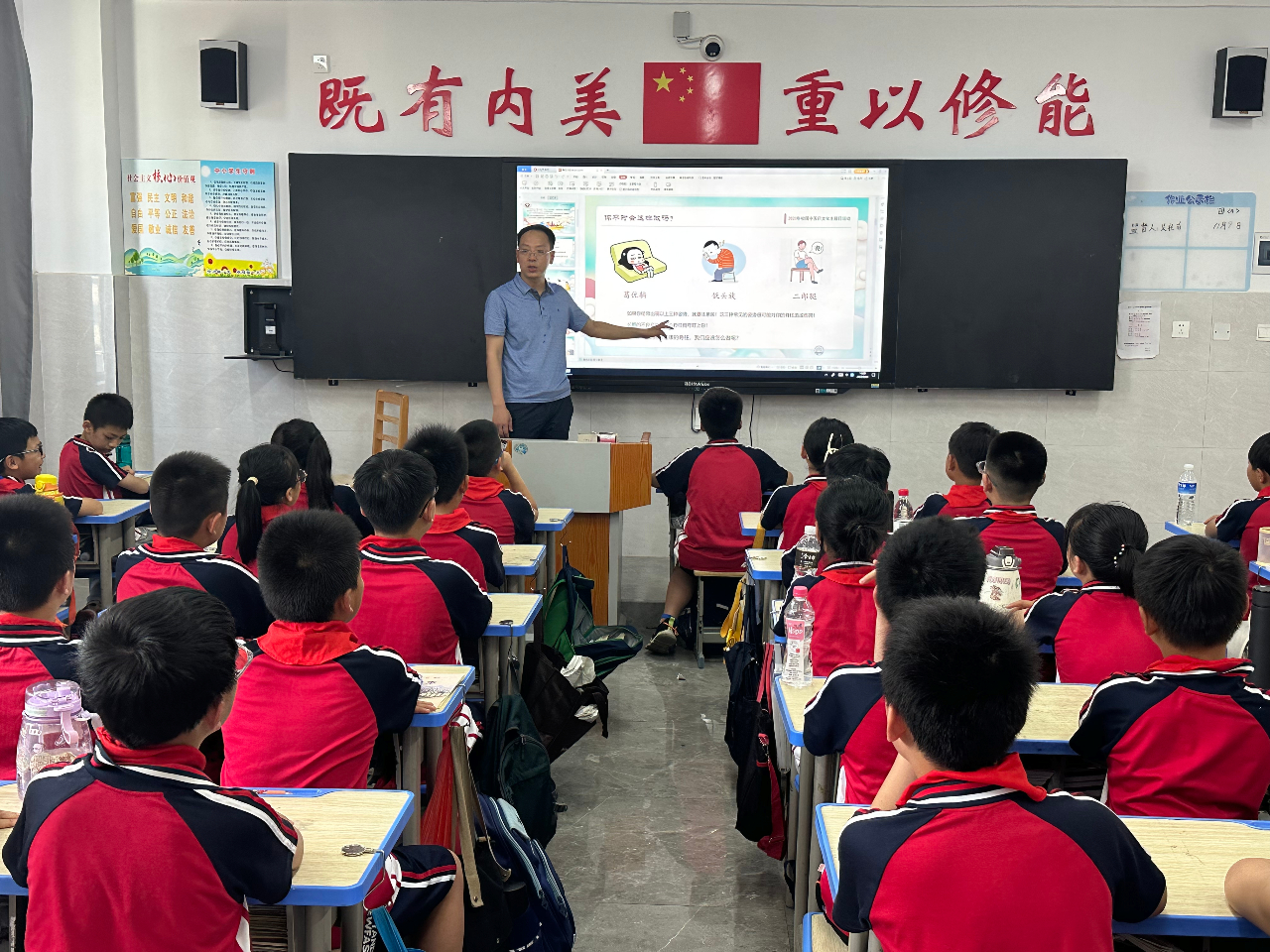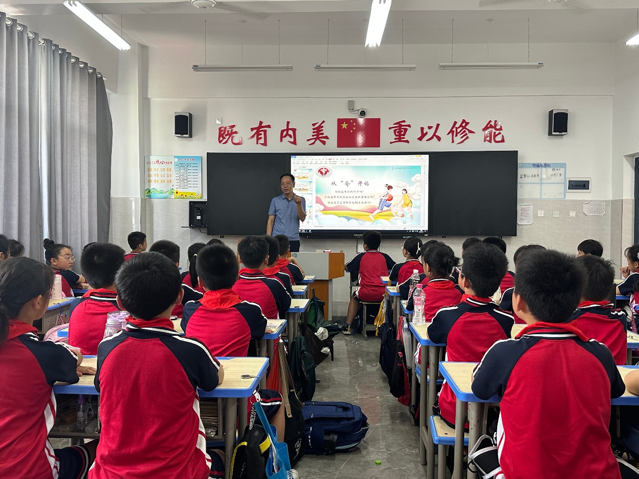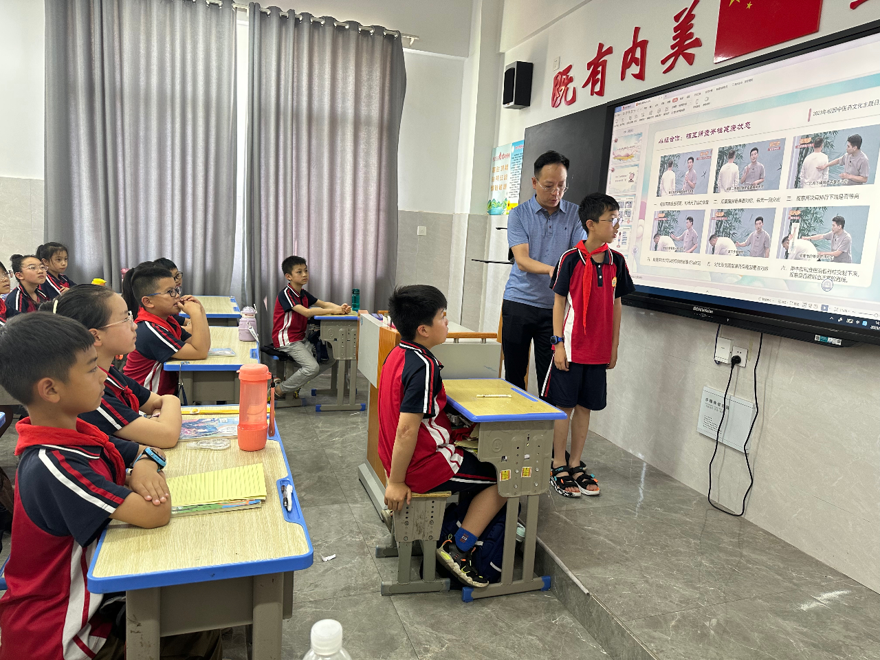 二、学生通过观看科普专家演示视频,余江区中医院创伤中心聂主任结合小学生脊柱健康状况及其生长发育特点,设计了精彩的脊柱健康课程,由浅入深的向学生们进行讲解。通过形象的图片、视频等方式向同学们讲解了正常人体脊柱的重要地位、脊柱侧弯的概念、脊柱侧弯的表现、脊柱侧弯成因及危害等内容。 分组筛查脊柱健康状态,总结脊柱侧弯预防举措,在生活习惯、日常饮食等方面养成关注脊柱健康的好习惯。