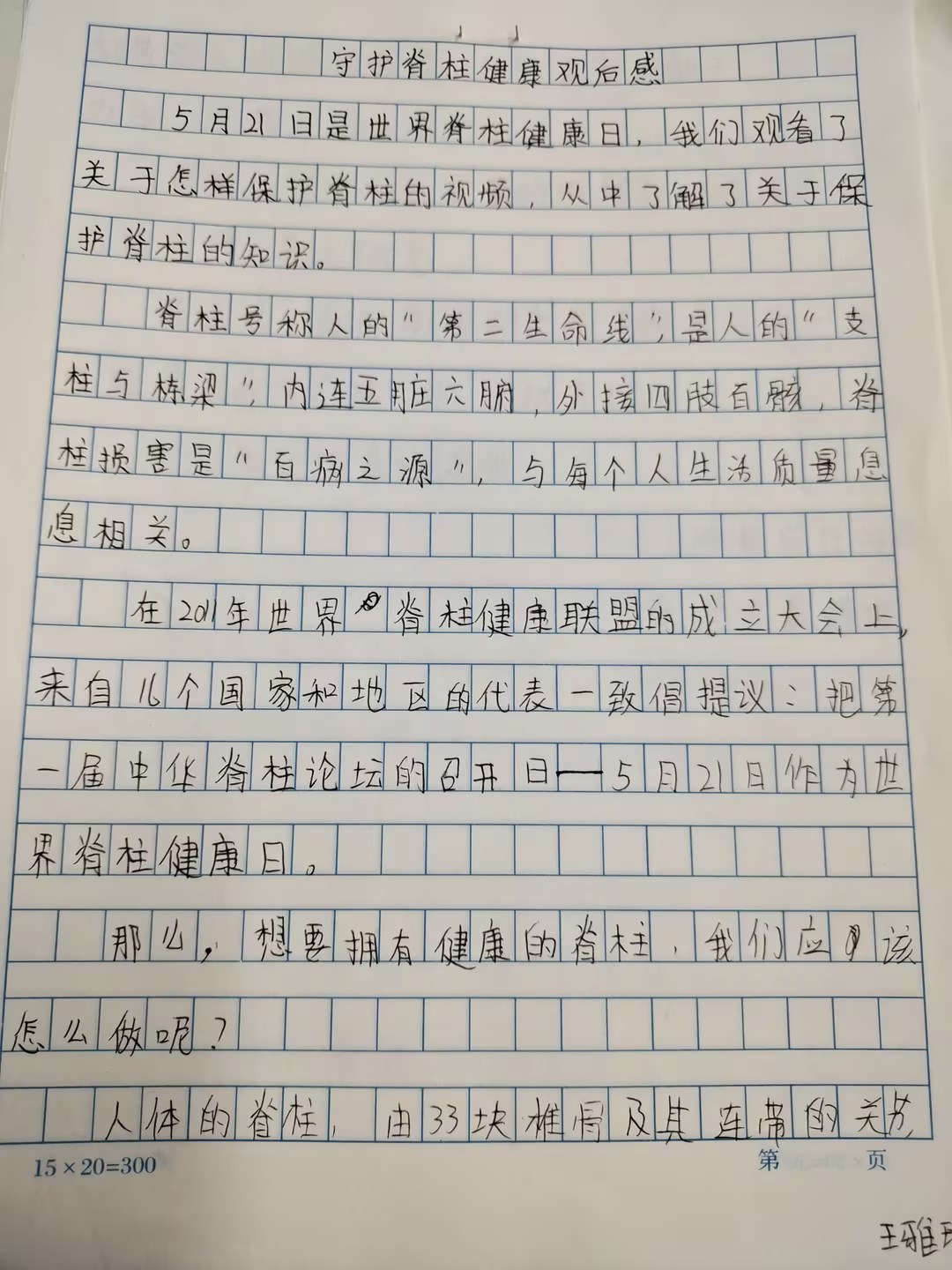 组织学生观看科普专家演示视频, 分组筛查脊柱健康状态,总结脊柱侧弯预防举措,在生活习惯、日常饮食等方面养成关注脊柱健康的好习惯。