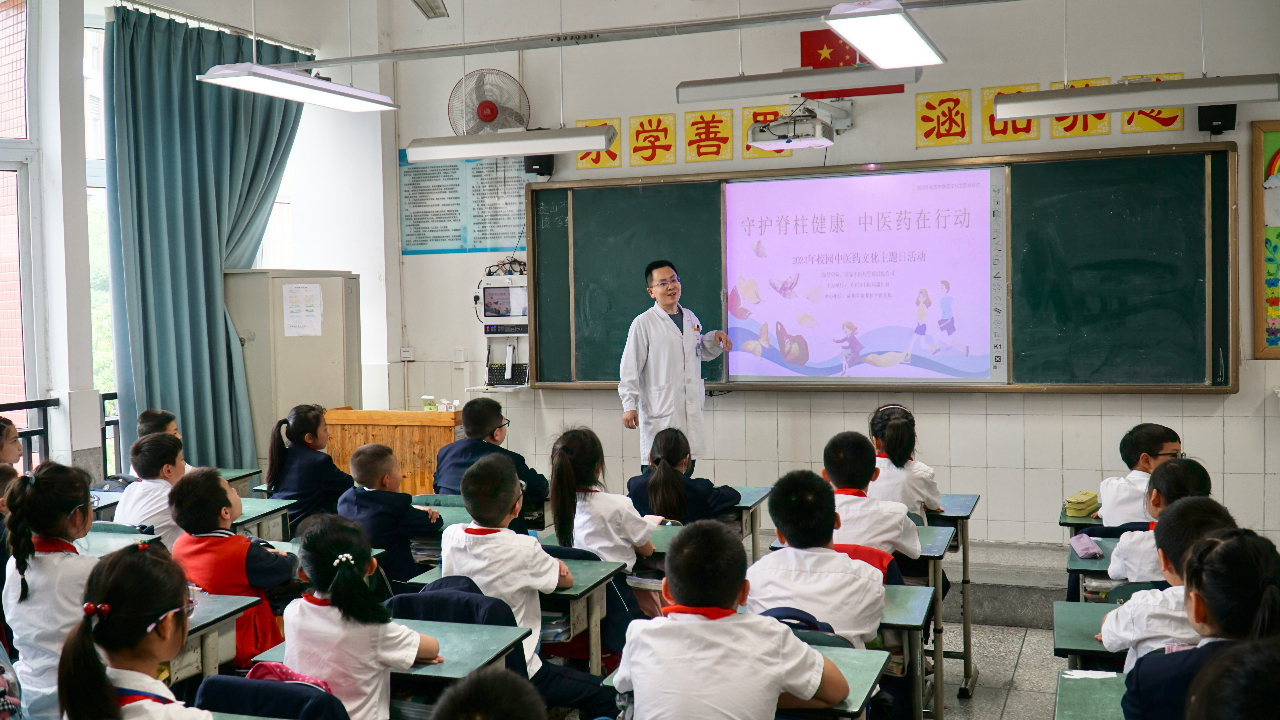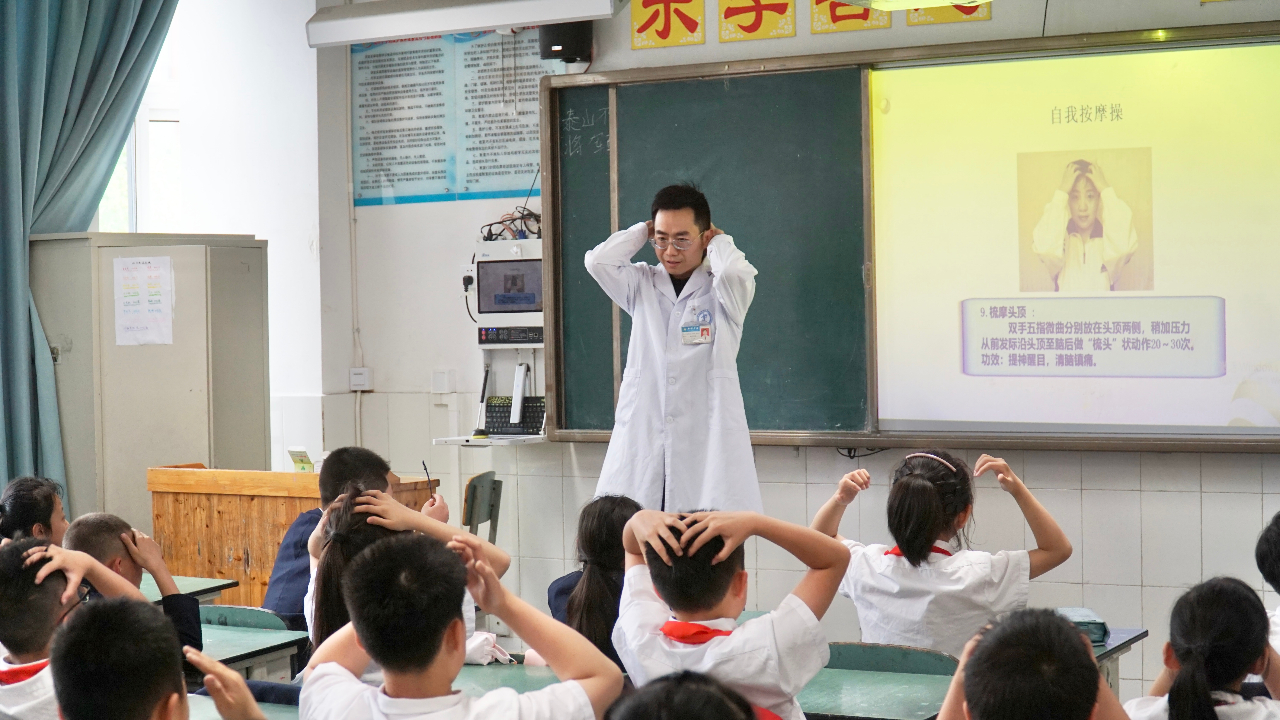25日,新都区中医医院治未病科儿童保健专家、副主任中医师梁河,骨伤一科副主任、副主任中医师文波用生动形象的课件和视频围绕中小学生脊柱侧弯的原因和危害,站、坐、卧姿、饮食、锻炼等方面进行预防和纠正脊柱侧弯开展主题活动。“百会穴、太阳穴、风池穴、内关穴、大椎穴、合谷穴……”老师们在互动环节教同学们怎么按摩相关穴位来缓解身体不适,现场带领师生学练颈部功能锻炼操。