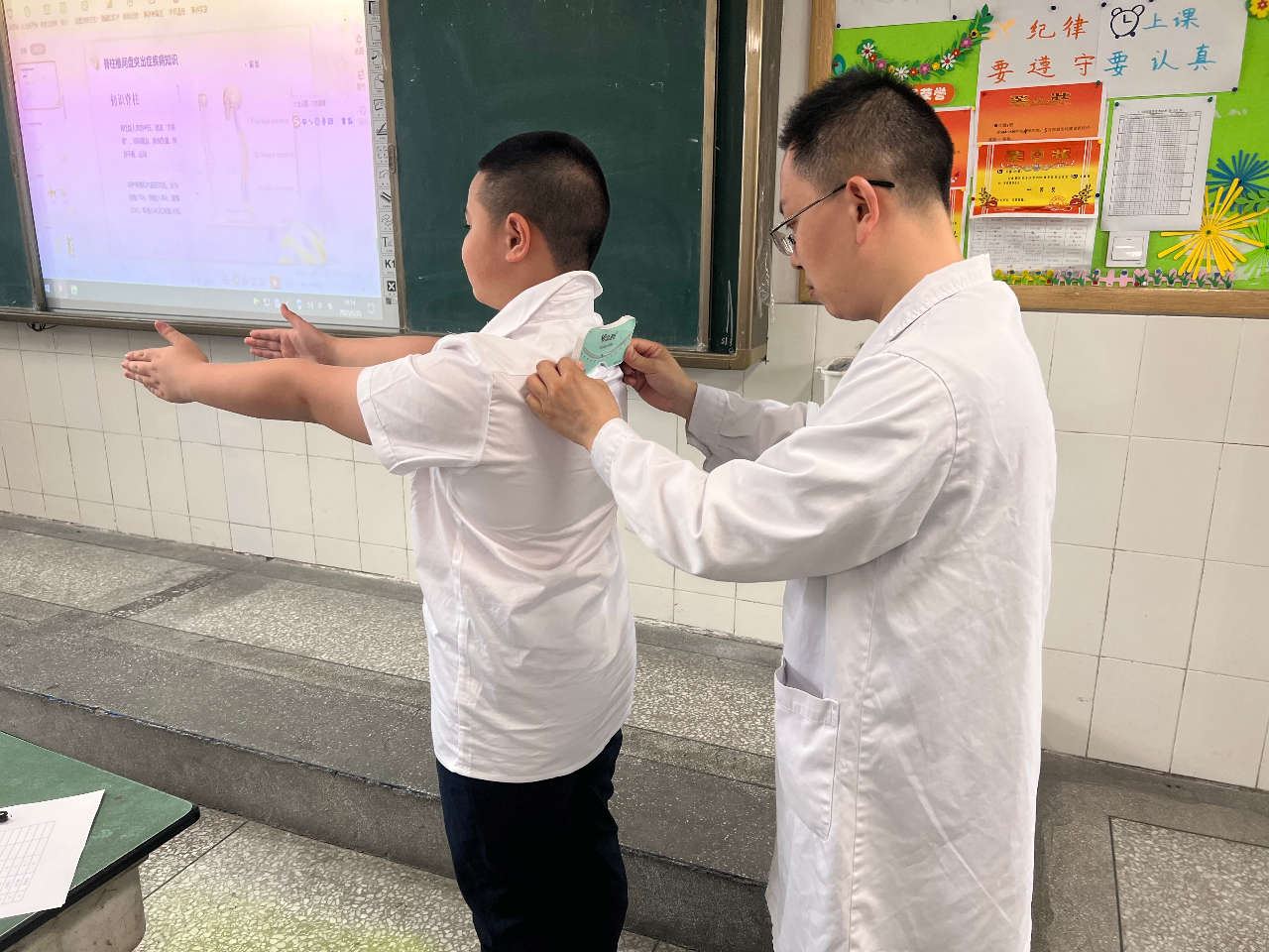 老师们使用专业测量工具对全班同学逐一进行脊柱侧弯筛查。课堂上,同学们现学现用,坐姿端正认真的听着,一起了解造成脊柱侧弯的相关知识,共同认识、学习了中医药文化。