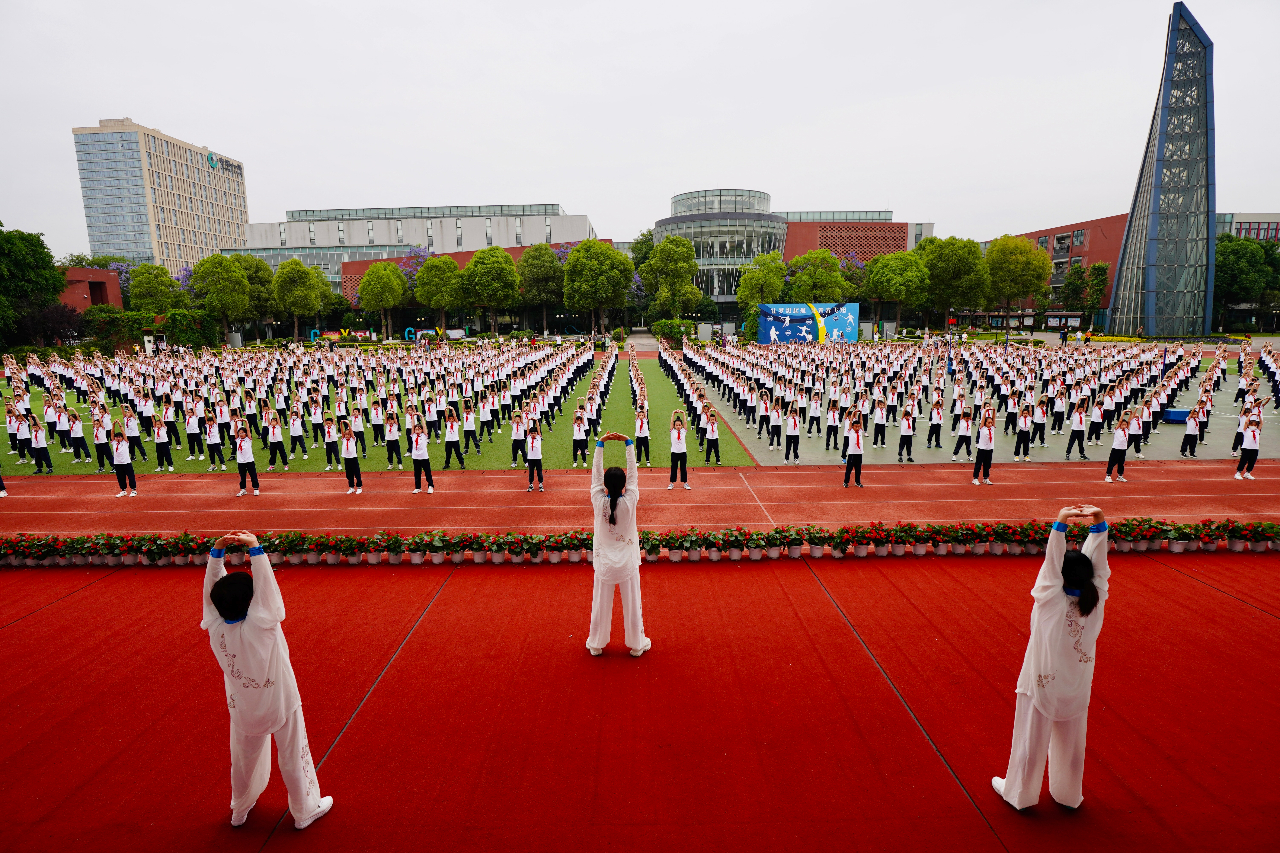 26日,新都区中医医院护理部主任、主任护师罗贞华带领两千余名师生开展养生气功八段锦课间锻炼。“呼气下蹲拉弓、吸气转重心……”八段锦源于中医气功疗法,以柔筋健骨、养气壮力为主要内容,具有改善循环、调脾胃、疏肝理气、固肾腰等功效。活动现场,老师们柔和缓慢、动静相兼,神与形合,气寓其中,同学们开步屈膝、仰头翻掌、两手攀足,一招一式有模有样地跟着认真练习。现场一派朝气蓬勃,阳光健康的景象。