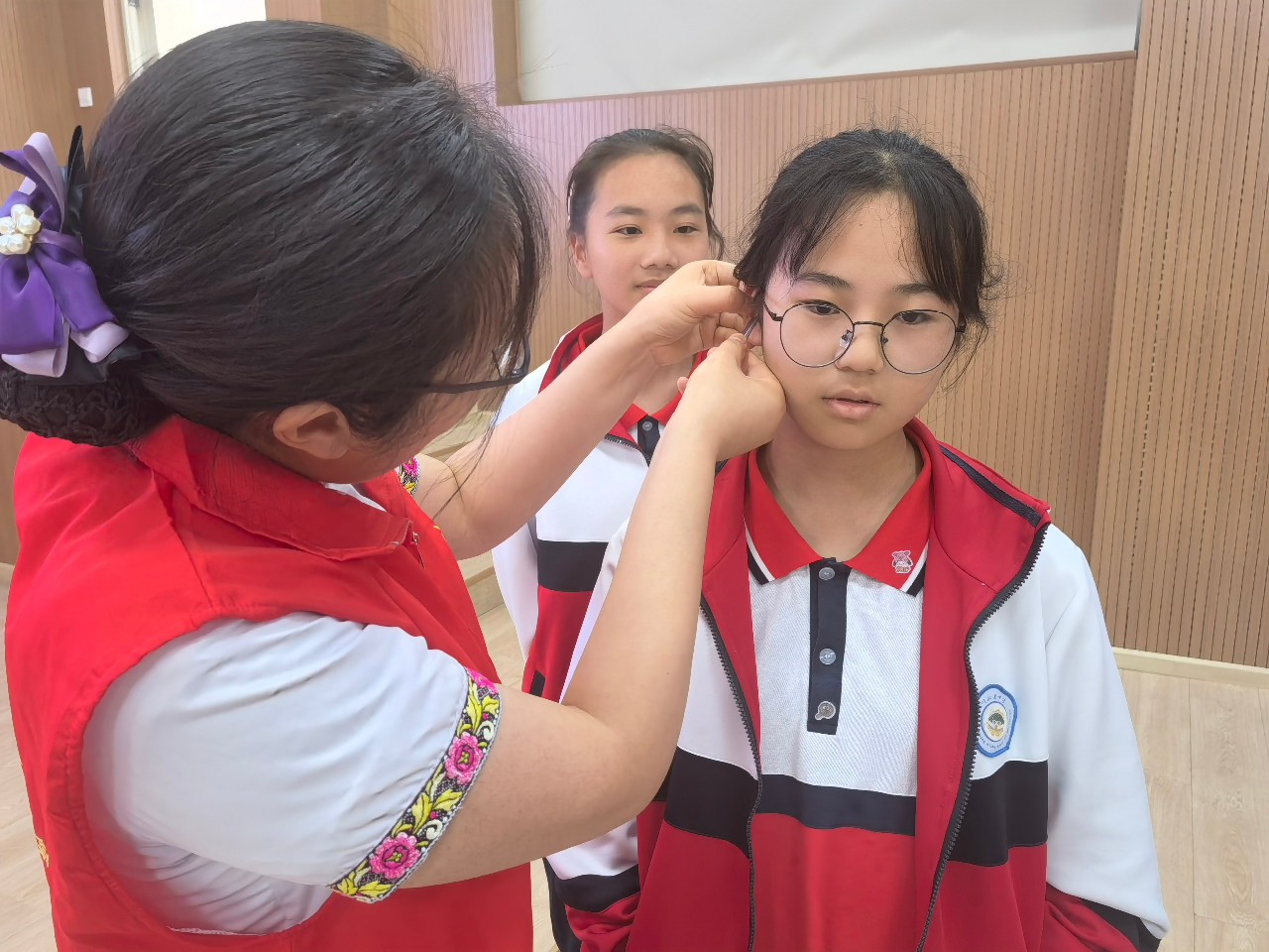 授课结束后,北川中羌医院针灸康复科护士长杨雯婷现场让学生体验了中医耳贴治疗近视项目,在场学生积极参与了进来。同时提高了同学们预防近视的意识。