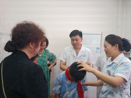 三台县中医院的针灸康复科老师们在开展脊柱侧弯检查,指导家长检查方法