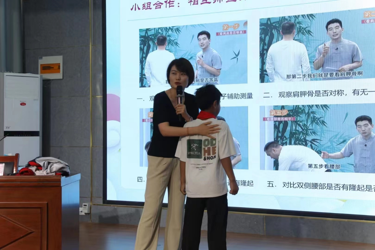 河南中医药大学第一附属医院驻鹿邑县中医院帮扶专家陈奕臻老师采用生动形象的课件和互动问答的方式为学生们讲解了“什么是脊柱侧弯、脊柱状态的自我筛查、怎样运用中医药知识守护自身脊柱健康”等相关知识,提高了学生们的脊柱保护意识,为他们养成健康的生活运动方式打下了坚实的基础。