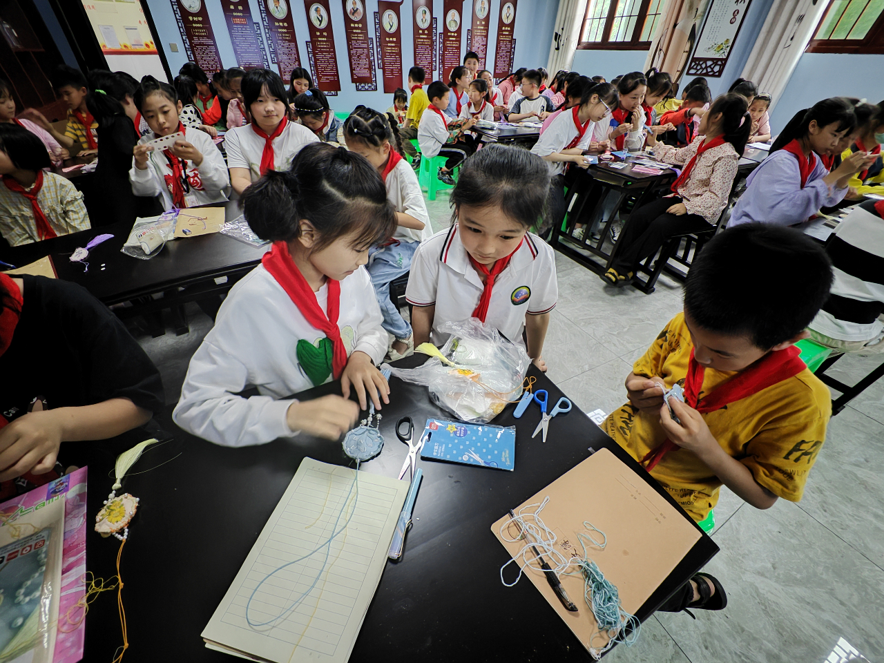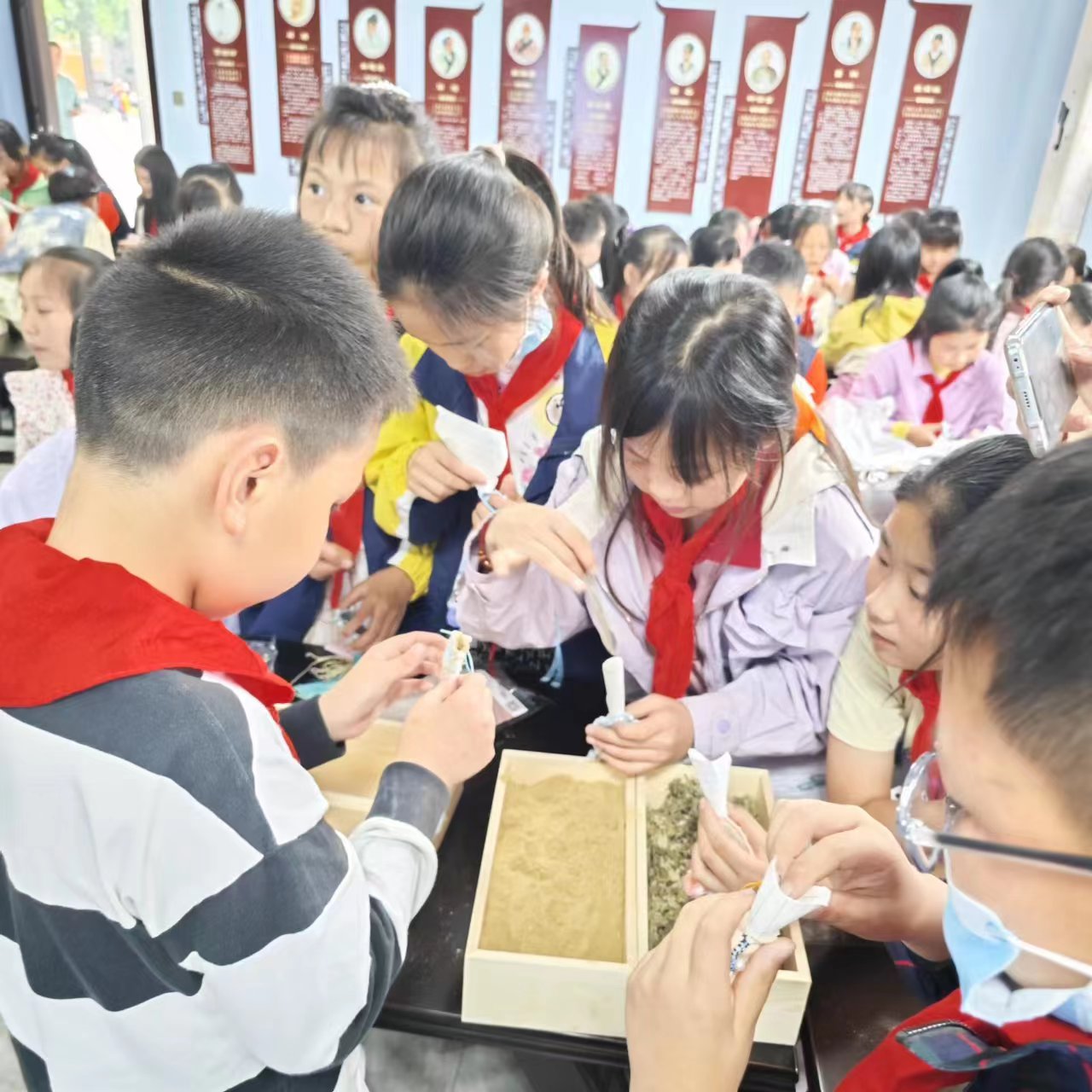 最后,在同学们浓烈的学习氛围中,师生们完成了互动游戏,了解中药香囊,现场演示并亲手参与制作。中药香囊能起到对居室消毒杀菌、驱除虫害、清洁空气的作用,对呼吸道传染病等也有预防效果,由藿香、佩兰、艾叶、苍术等组成。有的同学体会中药是香的,有的同学闻了后觉得是苦的,感观各有不同。香囊2-4周更换一次,具有健脾驱蚊预防呼吸道疾病的功效,孕妇和药物过敏者不宜使用。同学们从不会到熟练的制作中药香囊、背诵中医《四总穴》歌诀,灵活的把中医中药知识和操作融合在一起,实现中医的新发展,新思路,新未来。