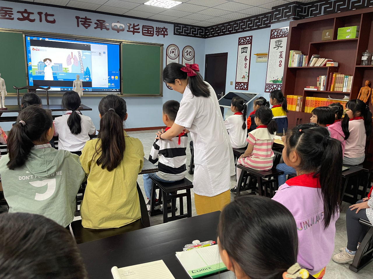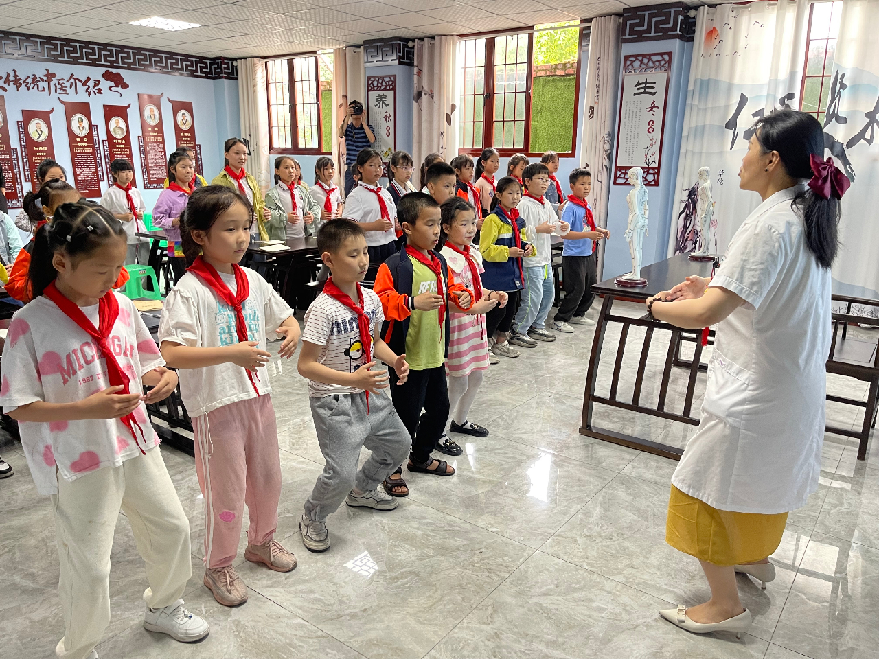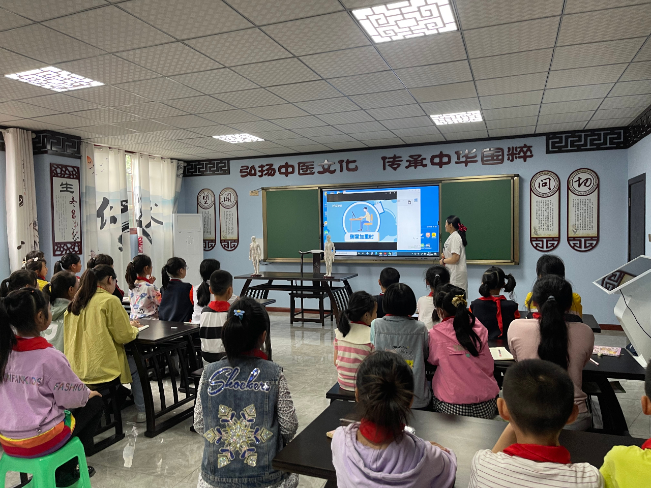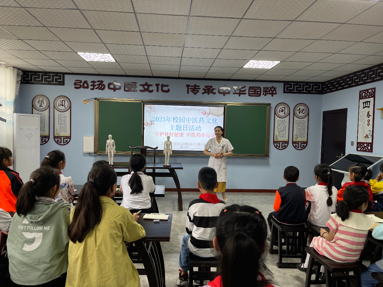 为持续深化中小学中医文化宣传教育工作,进一步扩大中医药文化进校园社会参与度,引导儿童青少年养成良好生活习惯, 在“世界脊柱健康日”即将到来之际,2023年5月18日下午15点,重庆市永川区大安街道社区卫生服务中心联合重庆市永川区大安小学,在古色古香的“歧黄雏学馆”中医药文化宣传教室,开展了“守护脊柱健康 中医药在行动”2023年校园中医药文化主题日活动,45名师生参加活动。