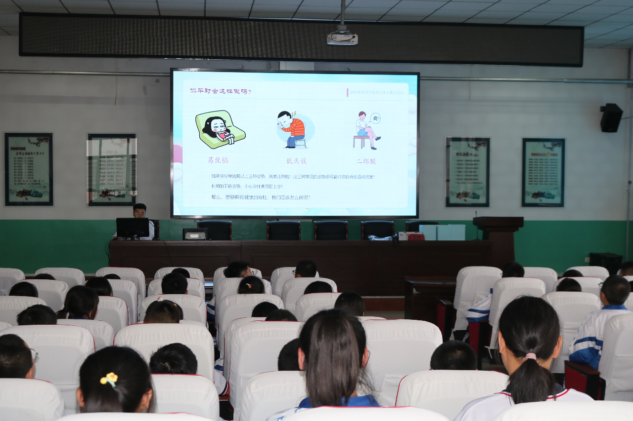杜春阳医师介绍道,脊柱具有强大的支撑躯体、保护脊髓、允许身体完成弯曲及旋转等动作的作用,人体的灵活运动离不开脊柱。医师还通过真实病例列举了临床中常见的儿童脊柱发育问题:如急性斜颈、脊柱侧弯,对比正常儿童与患病儿童的图片,让同学们直观地认识到脊柱疾病的危害。借此呼吁大家在日常生活和学习中注意正确的颈部姿势及坐姿,不要长时间低头,避免颈部外伤。同时,医师让同学们了解脊柱的中医护理常见方式,如艾灸、针灸、刮痧等,同学们听后纷纷坐的笔直,大家互相比较谁的坐姿更标准。