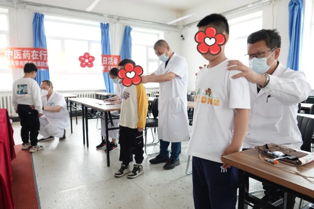 为充分发挥中医药在青少年脊柱侧弯防治中的积极作用,传承弘扬中医药文化,促进青少年学生健康成长,5月25日,黑龙江中医药大学附属第四医院由刘景隆、赵忠辉、樊祜敏、孟令雪及工作人员等8人组成的专家团队走进电工小学校,开展“守护脊柱健康 中医药在行动”中药文化主题日活动——“脊柱侧弯筛查”义诊活动。