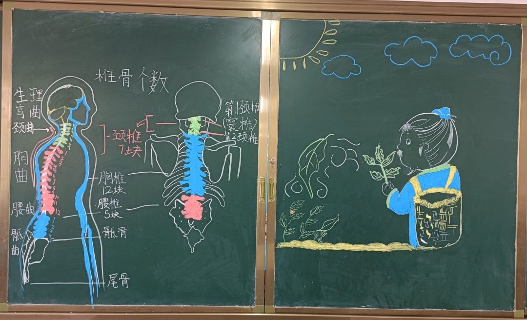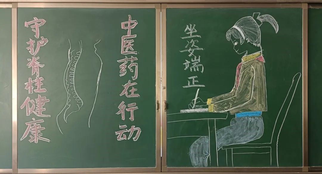 各班绘制“关注脊柱健康”主题板报,并进行评比。一支粉笔,书写中医知识,一方天地,融合中医文化,一间教室,营造中医氛围。在教室中医氛围的营造中,潜移默化地发挥中医药知识的“文化”和“美化”功能。