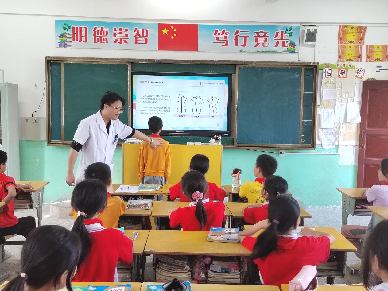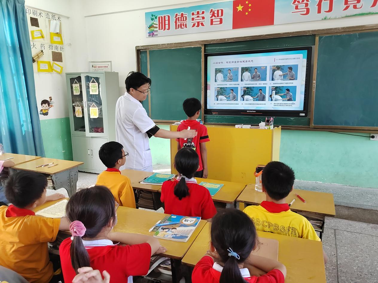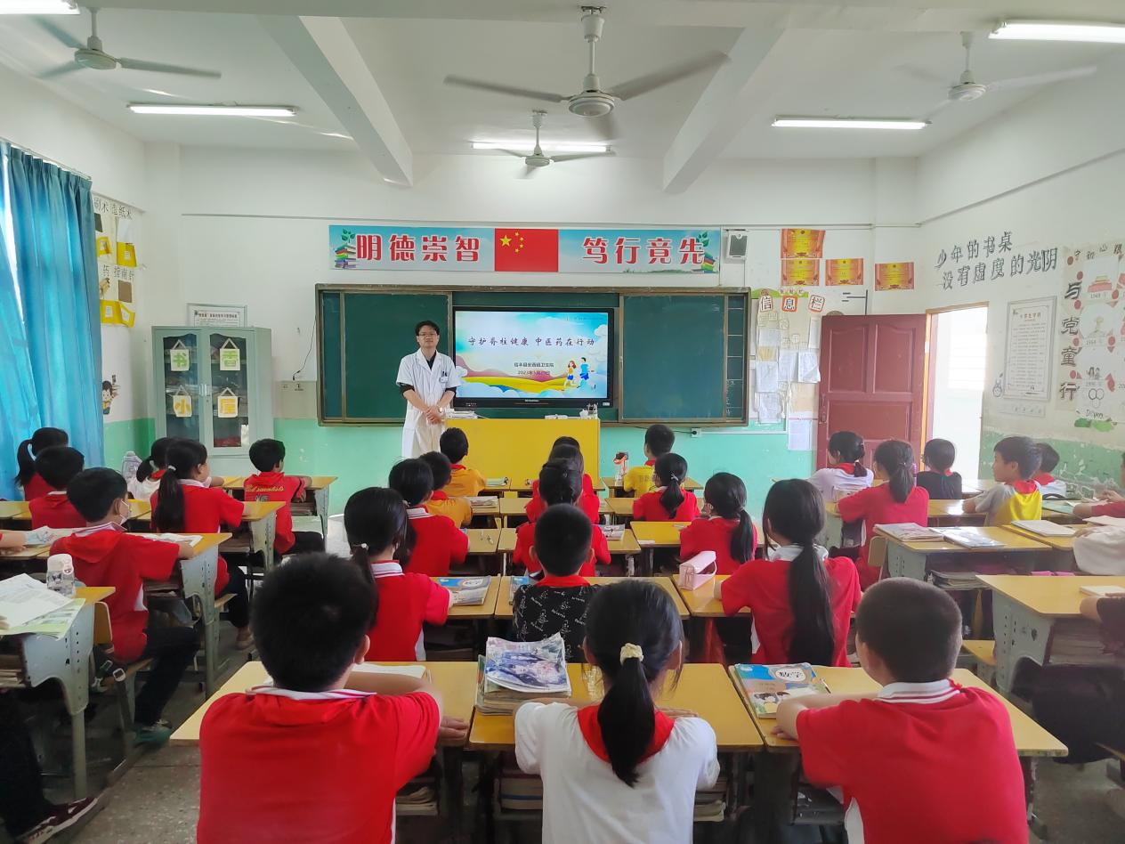2023年5月29日下午,安西镇卫生院组织中医科医生前往安西镇莲丰小学开展“守护脊柱健康,中医药在行动”的中医知识讲座活动。讲座现场医生为小学生讲解脊柱疾病的相关知识、自我筛查脊柱健康状态和习练中医药传统养生功法等内容,并播放中医药科普动画短片、与他们开展互动交流,学生们积极回答医生问题,现场气氛热烈。