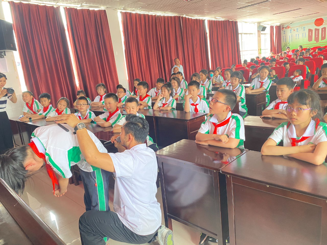 脊柱号称人的“第二生命线”,是人的“支柱与栋梁”,内连五脏六腑,外接四肢百骸,脊柱损害是“百病之源”,与每个人生活质量息息相关。该院治未病科医师范斌和中医小组护士邹柳围绕“从脊开始”——了解脊柱知识、“触手可脊”——自我筛查脊柱健康状态以及“大显身手”——习练中医药传统养生“五禽戏”三个方面授课,结合学生实际情况,着重讲解了日常生活中预防脊柱侧弯的方法,指导学生以“六步筛查法”两两相互进行脊柱健康自我筛查,习练中医养生“五禽戏”,宣传中医药在保护脊柱健康中的重要作用,让同学们零距离的感受中医、了解中医、认同中医,将中医药文化在孩子们心里播下传承的火种。整个课堂上同学们聚精会神,认真倾听,积极参与互动,踊跃回答问题,现场气氛热烈,加深了学习成效。