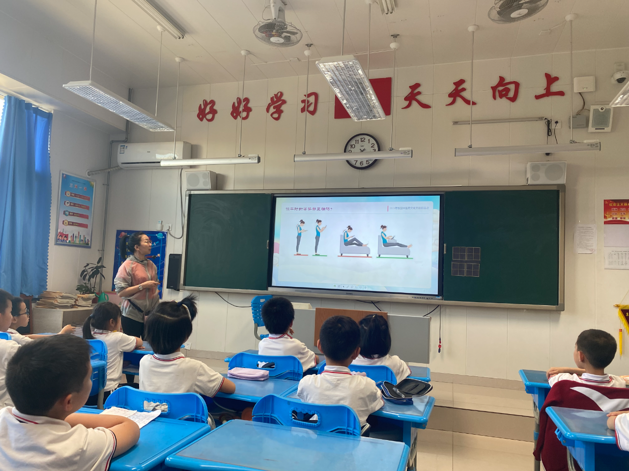 本次活动设立报告厅主会场和各班教室分会场同步进行,全校师生共计两千余人参与活动,由学校中医药文化专职教师孙延超担任主讲。孙老师以我国中小学生常见的不良坐姿导入主题,通过形象的图片、有趣的动画视频向同学们介绍了脊柱、脊柱上的督脉、脊柱的作用。接着以深入浅出、通俗易懂的方式向同学们讲解了什么是脊柱侧弯、脊柱侧弯的成因及其危害,同时从日常站姿、坐姿、卧姿、锻炼及饮食等方面讲解了防治脊柱侧弯的科普知识。
