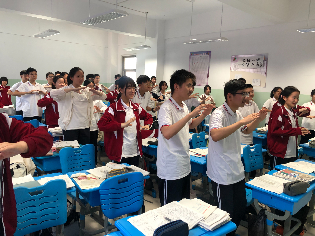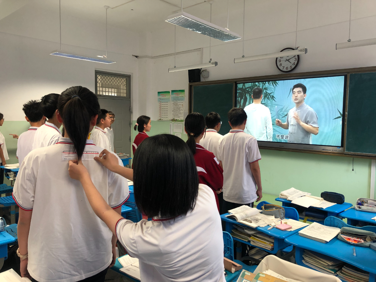 理论知识讲授结束后,孙老师通过教学视频和现场示范的方式,对学生进行了简单的脊柱侧弯测试和形体指导,进一步提高了同学们对脊柱侧弯的认识和重视,让同学们能够正确检查和维护脊柱健康。最后在活动现场,全体师生跟随华佗五禽戏第59代传承人华一老师的教学视频,一起习练五禽戏。同学们积极互动,反响热烈,纷纷表示受益匪浅。