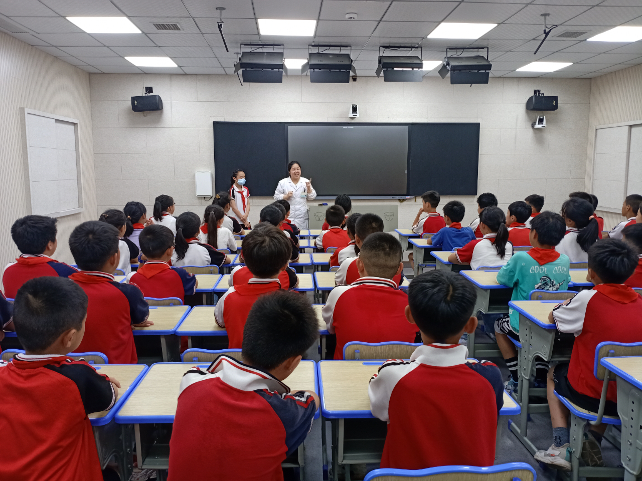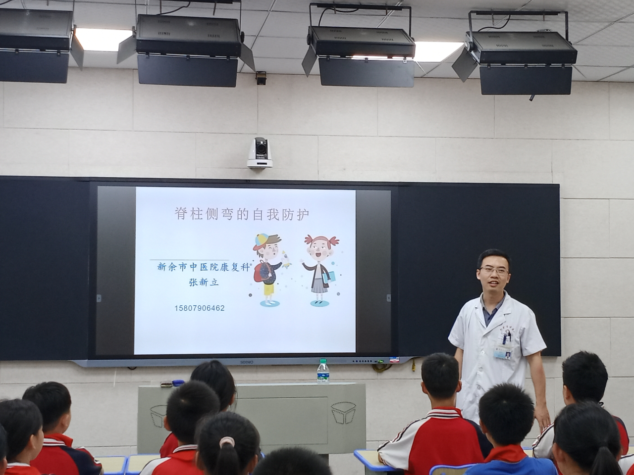 5月29日,新余市长青小学特邀市中医院医生张新立、张桃花到校,开展预防脊椎侧弯健康讲座。一个班同学在现场听,其他班同学在教室利用一体机收看直播。