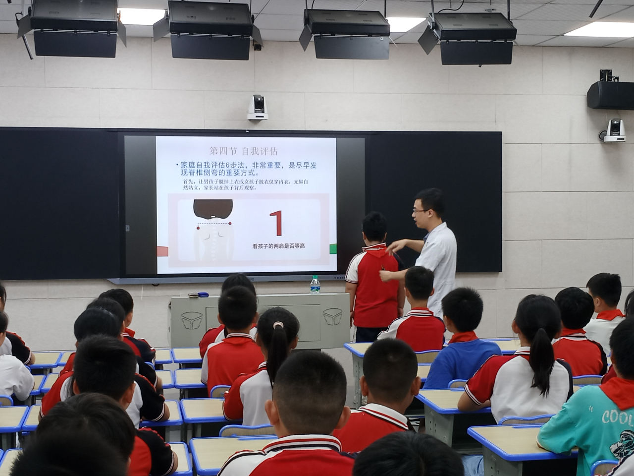 张新立医生从脊椎侧弯的病种分类、病因、症状表现、危害、治疗干预措施等进行了翔实讲解,教给同学们脊柱侧弯家庭自我评估6步法。尤其对脊椎侧弯的预防方式方法等进行细致的讲述,告诫同学们要在学习生活中养成背双肩书包、睡觉卧躺、常进行科学运动等习惯,远离脊椎侧弯,呵护好自己的身体。张桃花医生带领同学们现场筛查脊柱健康状态,做预防脊柱侧弯养护操,总结脊柱侧弯预防举措,强调在生活习惯、日常饮食等方面养成关注脊柱健康的好习惯。