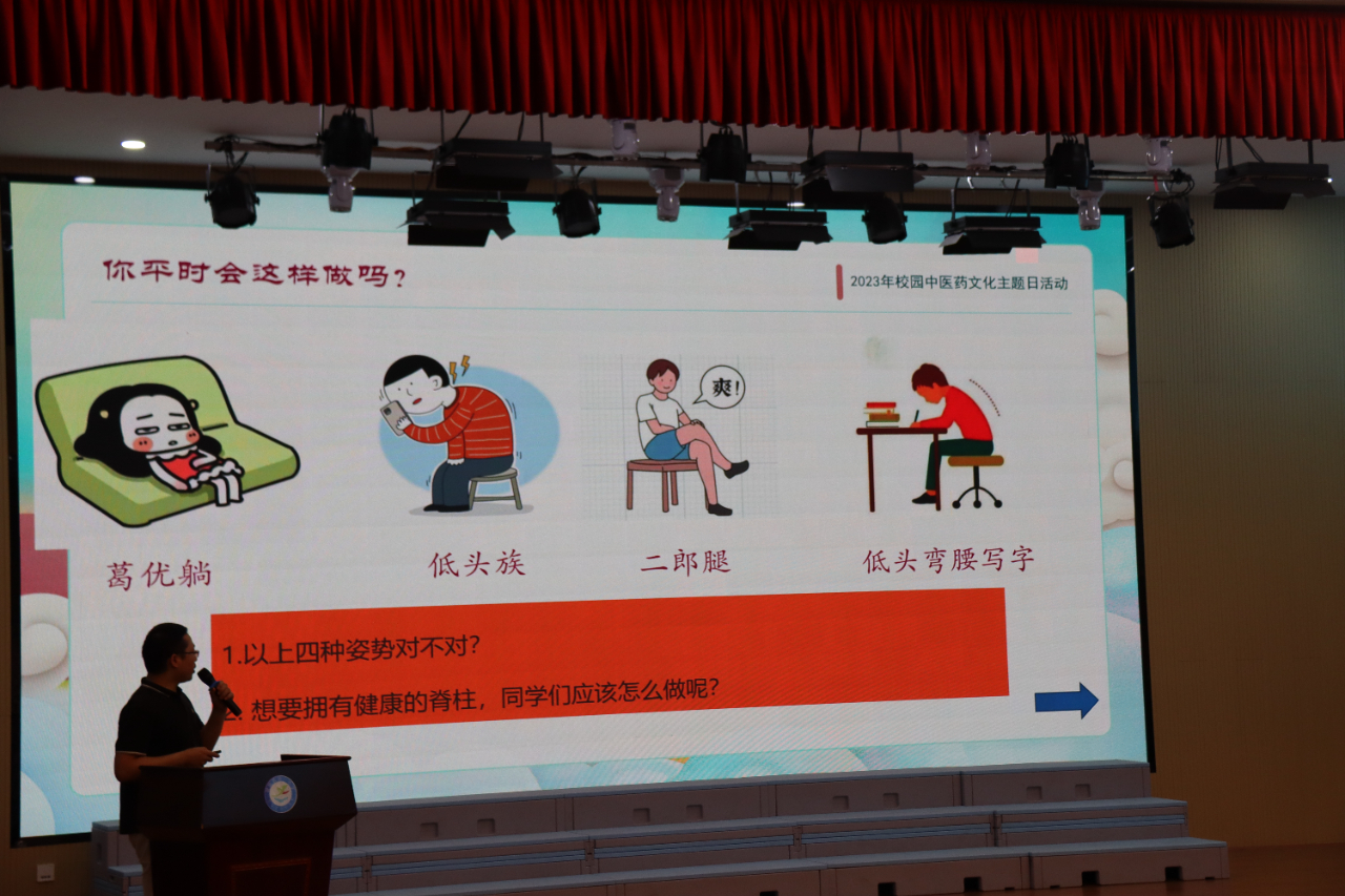 1、“从脊开始”播放“灸童说”中医药科普动画短片:中医认为,“背为阳,腹为阴”,背部是人体阳气循行的最大通道,统摄一身之阳。同时,支撑整个背部的脊柱,称为“龙骨”,这足以说明脊柱在古人心目中的重要地位。脊柱不正,可诱发多种疾病。由此可见,脊柱是人体很重要的部位,养好脊柱才能成为真正顶天立地的“龙的传人”。“上梁不正下梁歪”。展示一些同学们读书、写字、看电子产品时常见的不良坐姿,以及一些变形的脊柱图片。——互动讨论。探讨影响脊柱健康的坏习惯、造成脊柱侧弯的原因、脊柱健康与视力的关系等。认识脊柱侧弯的危害,从中医的角度(督脉运行气血)讲解脊柱侧弯和身体健康的关系自我筛查脊柱健康状态。