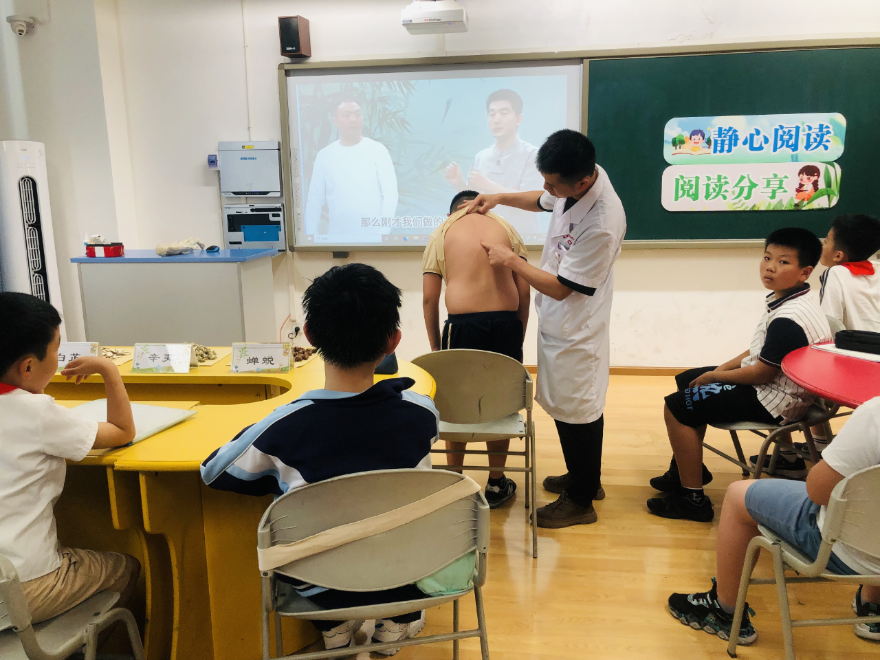 在互动环节中,成都锦欣中医医院针灸科徐彪主任邀请学生了解脊柱侧弯的“六步筛查法”及按摩相关穴位来缓解身体不适,并为同学们做脊柱健康筛查。通过互动游戏的方式进一步巩固所学到的知识。