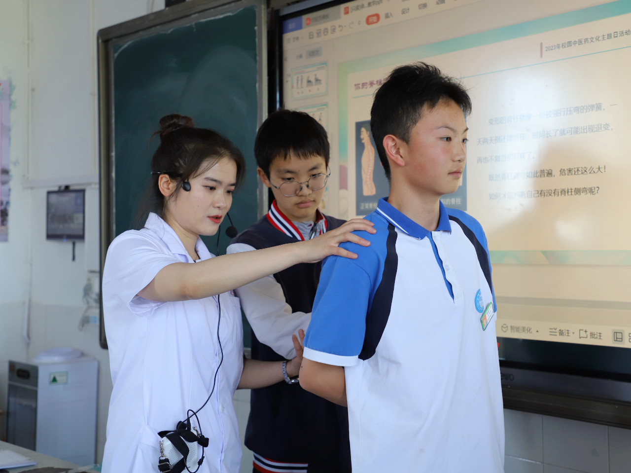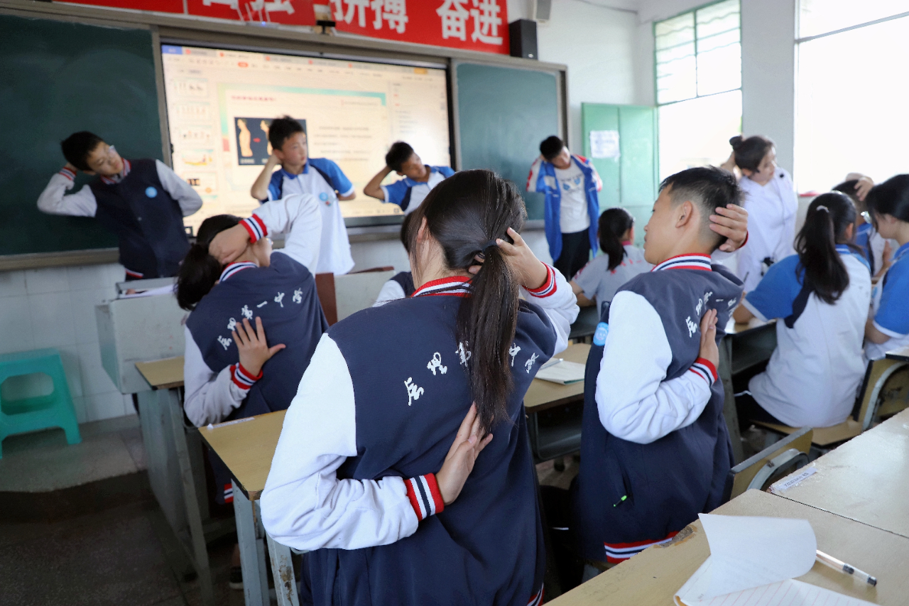 期间,同学们在轻松愉快的互动中对青少年常见不良姿势、脊柱侧弯的发病情况以及脊柱侧弯的危害等脊柱健康问题有了初步了解。同时,通过对五禽戏由来的介绍和现场习练,让同学们对中医药传统养生功法如何保持脊柱健康有了更深的理解。