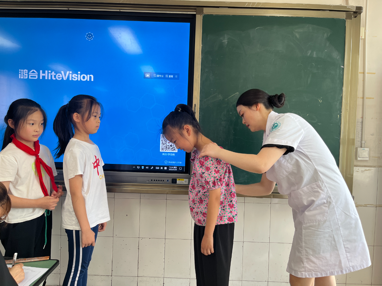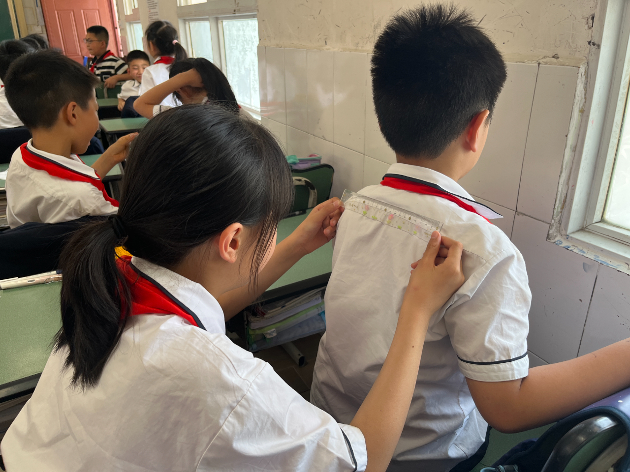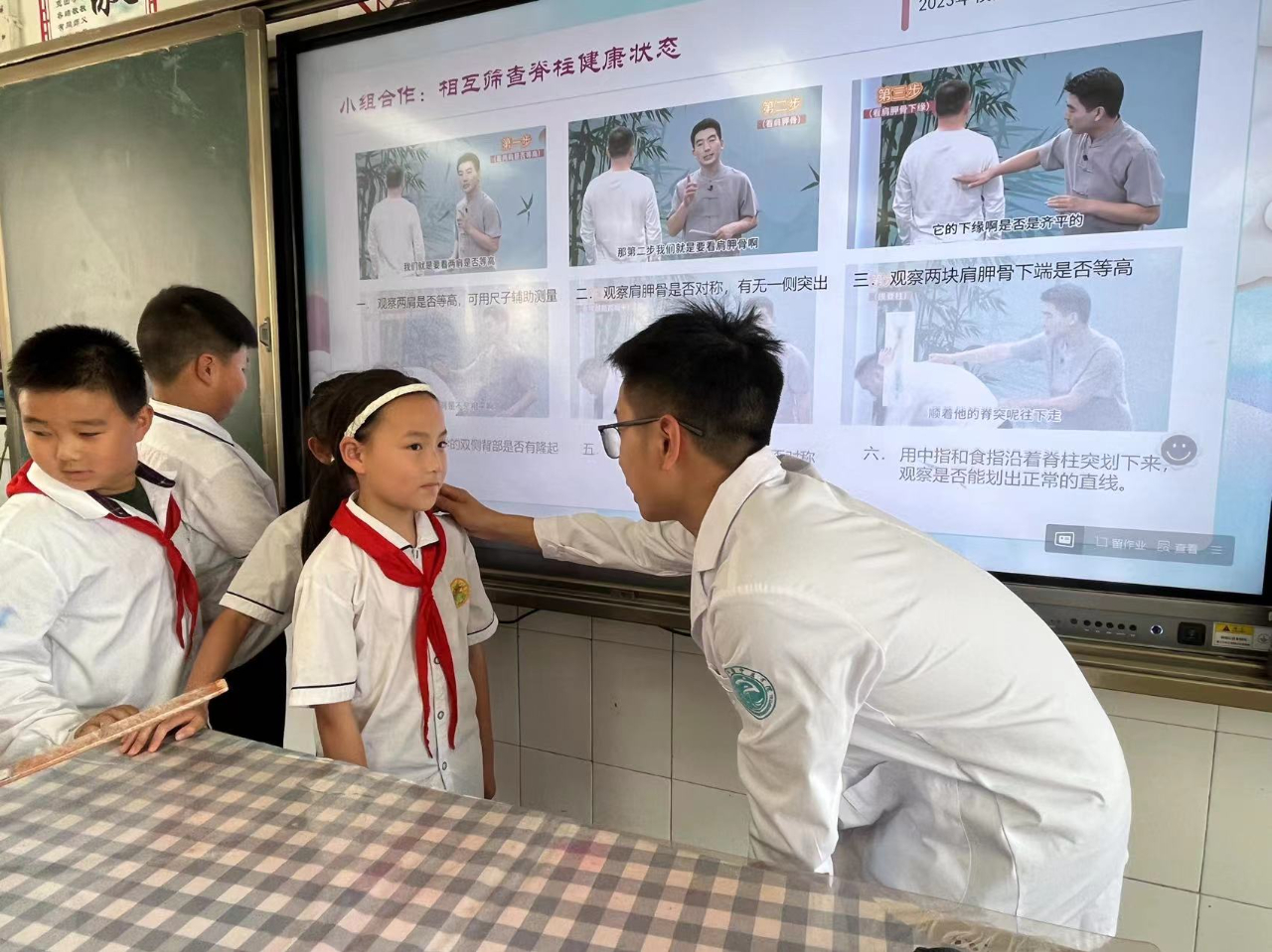 通过观看脊柱健康“六步筛查法”视频,在老师的安排示范下,同学们分组尝试检测了同桌的坐姿和站姿是否正确,老师还提醒学生们要互相监督,要养成良好的防脊柱侧弯的好习惯。课程结束,中江县中医医院的老师们大显身手,给三年级每个孩子都进行了脊柱筛查,帮助孩子们早发现,早纠正,早控制。