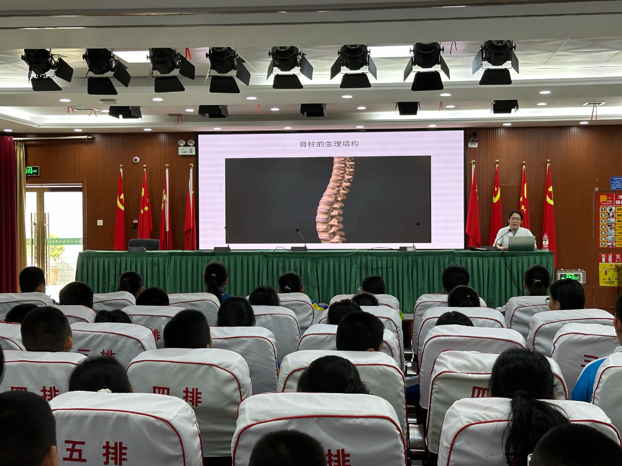 聆听专家讲座,学会锻炼脊柱。在泰安市卫监委中医药政法科教科的积极协助下,学校邀请到了泰安市中医医院康复科专家玄丽娜,为学生讲解青少年脊柱侧弯的相关知识,引导学生在生活习惯、日常饮食等方面养成关注脊柱健康的好习惯。玄老师还带领同学们学习了“五禽戏”和“脊柱侧弯导引操”,鼓励同学们锻炼脊柱、增强体质。