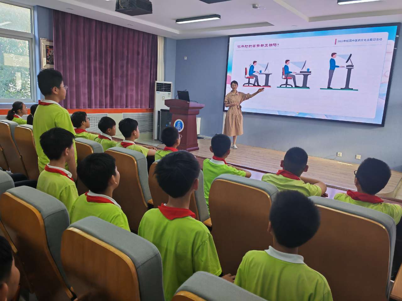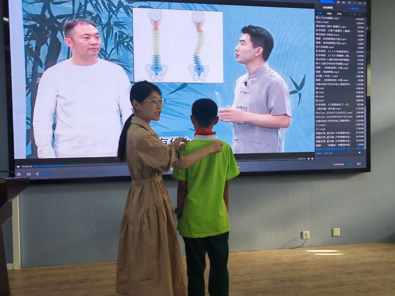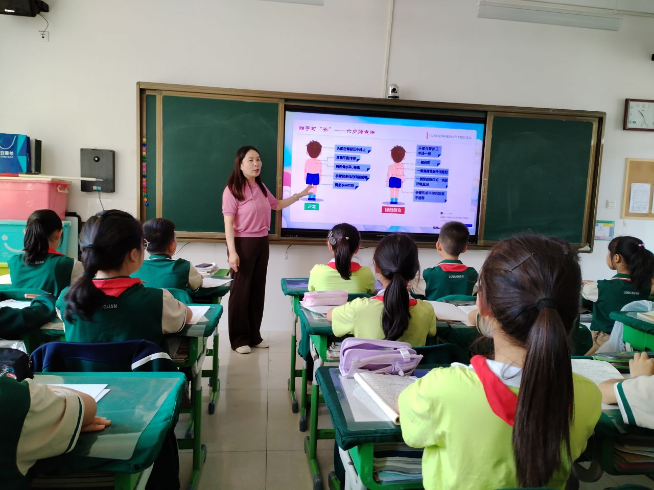 全校师生共同参与本次活动,各班中医药文化教师担任班级讲课教师。老师们以我国中小学生常见的不良坐姿导入主题,通过播放“灸童说”中医药科普动画短片,引导学生学习相关中医知识:中医认为“背为阳,腹为阴”,背部是人体阳气循行的最大通道,统摄一身之阳。同时,支撑整个背部的脊柱,称为“龙骨”。随后联系生活实际进一步引导学生认识脊柱的重要性,反思自己在读书、写字、看电子产品时常见的不良坐姿,通过互动讨论探讨影响脊柱健康的坏习惯、造成脊柱侧弯的原因、脊柱健康与视力的关系等;认识脊柱侧弯的危害,从中医的角度(督脉运行气血) 讲解脊柱侧弯和身体健康的关系。