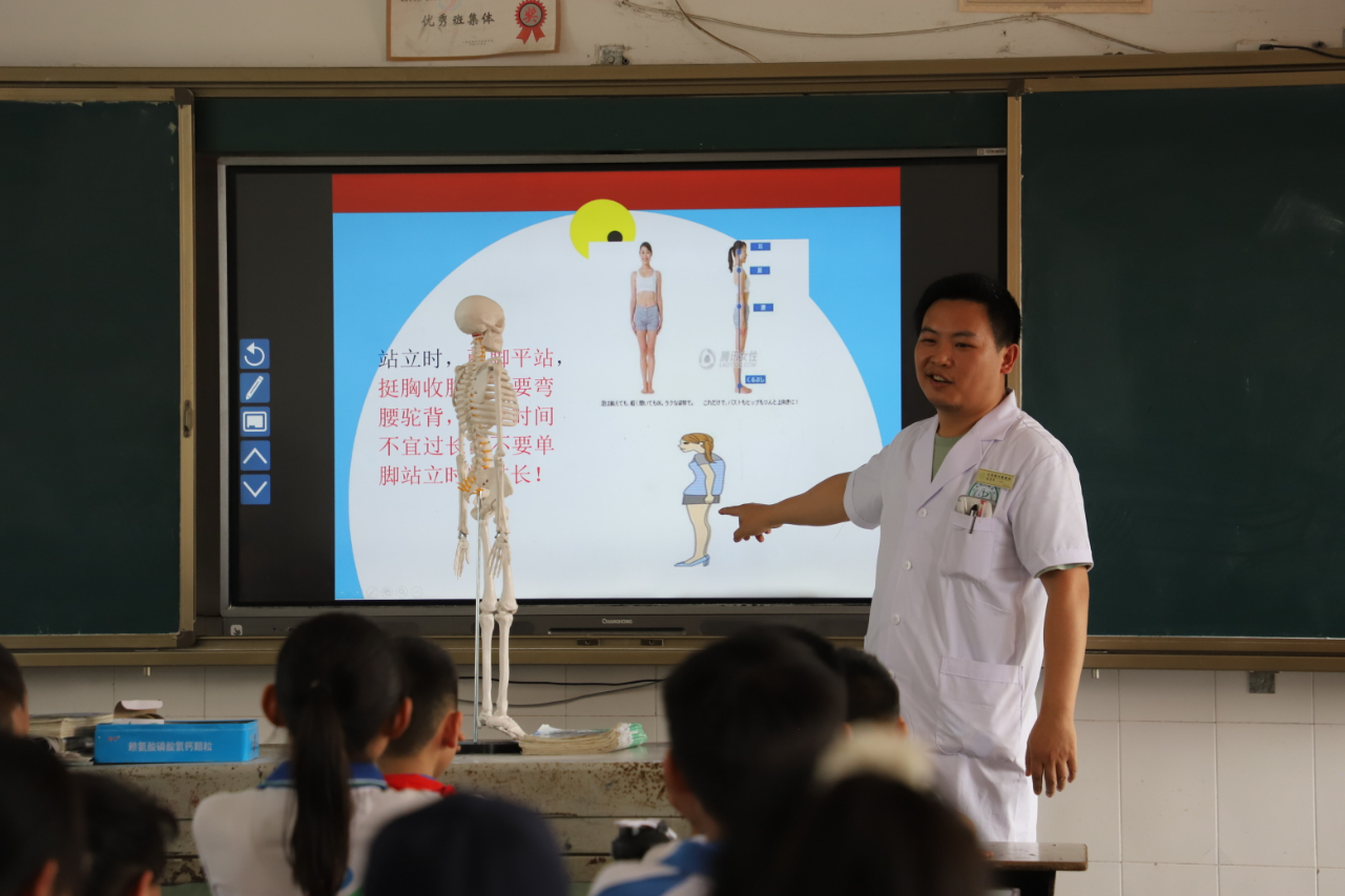 活动中,大英县中医医院骨伤科彭勇军主治医师通过形象的图片、有趣的动画视频向同学们介绍了脊柱、脊柱上的督脉、脊柱的作用。还讲解了脊柱侧弯成因及其危害,同时从日常站姿、坐姿、卧姿、锻炼及饮食等方面讲解了防治脊柱侧弯的科普知识。并且现场指导同学们学习脊柱侧弯的“六步筛查法”,自我筛查脊柱健康状态。引导学生纠正坐姿,进行脊柱健康标准示范。
