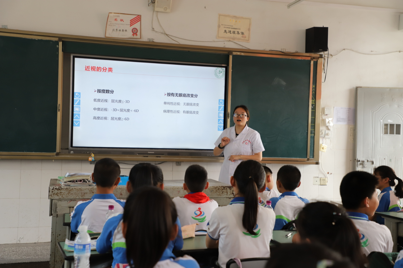 结合即将到来的“爱眼日”,眼耳鼻喉科的陈冬梅主治医师,为同学们讲解了眼睛的结构、近视的形成及如何正确用眼和用眼卫生等健康知识,并让现场同学们体验了中医适宜技术-耳穴埋豆。