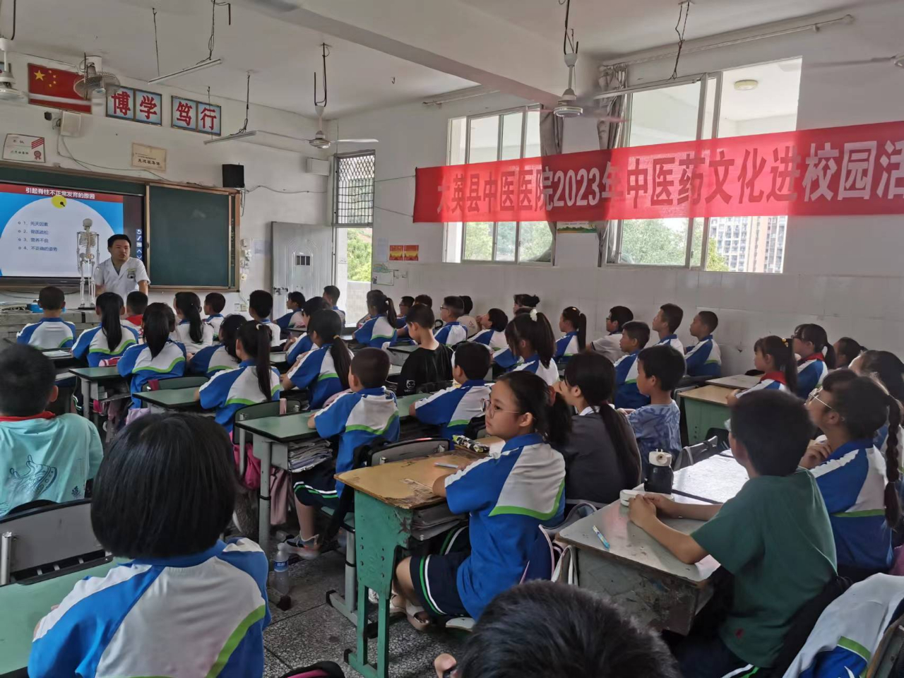 为传承中医药文化,培育青少年健康素养,普及脊柱健康知识,增强青少年预防意识,充分发挥中医药在青少年脊柱侧弯防治中的积极作用,5月30日下午,大英县中医医院走进大英县郪江外国语学校开展“守护脊柱健康 中医药在行动”2023年校园中医药文化主题日活动。