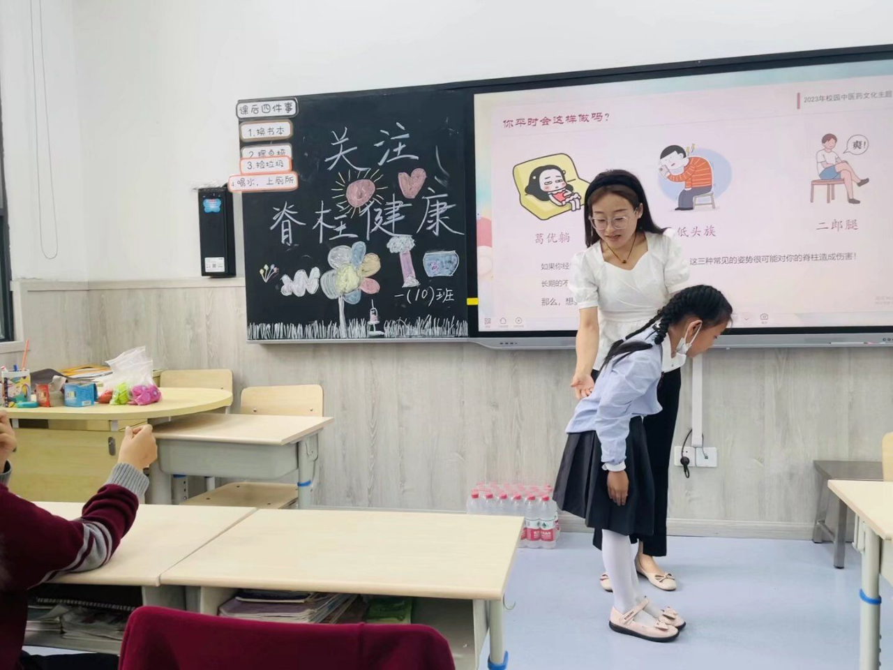 班会课上,现场播放中医药科普动画短片、展示不良坐姿图片,让同学认识脊柱侧弯的危害,造成脊柱侧弯的原因,讲解脊柱的构造和作用。