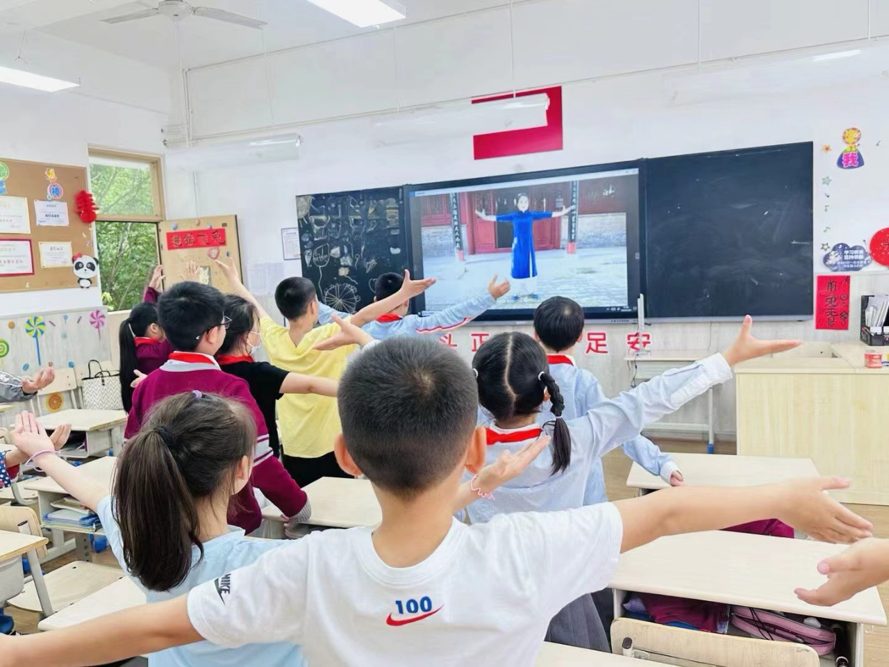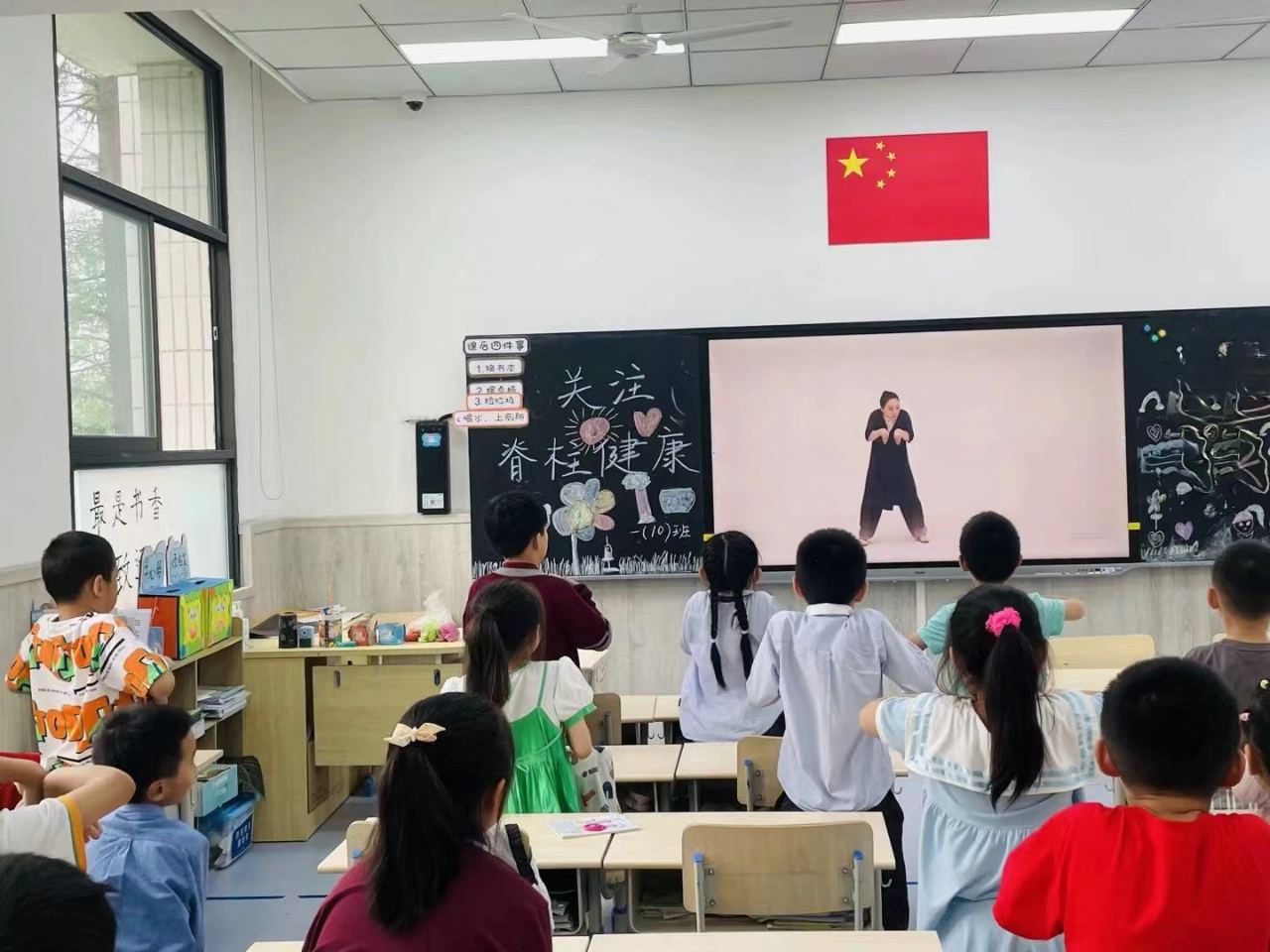 课堂上,老师带着同学们共同习练矫正脊柱侧弯导引操,让同学们知道了“五禽戏”和“健身气功——八段锦”是守护脊柱健康的中医传统养生功法,有助于增强脊柱的柔韧性和稳定性。希望每个同学都能拥有健康的脊柱,成为真正顶天立地的“龙的传人”。