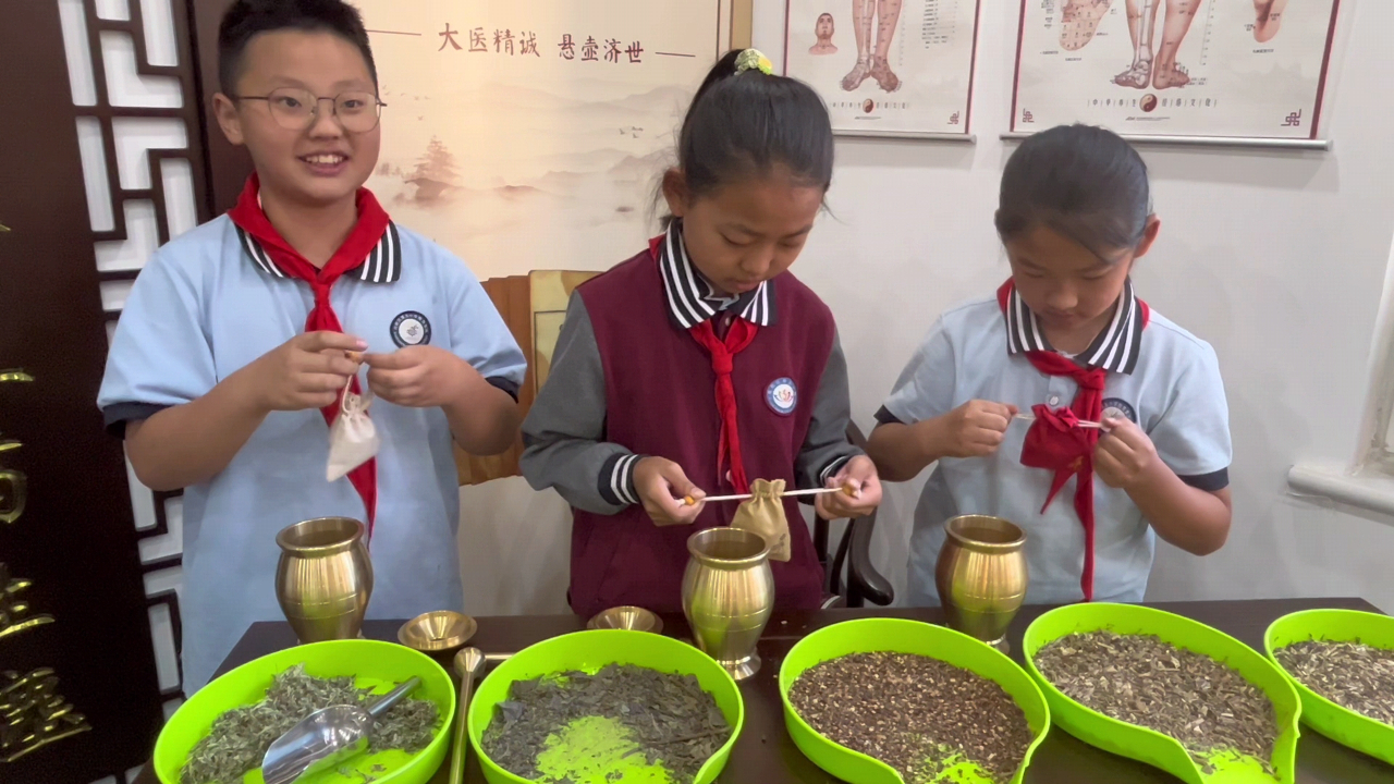 浓浓香草味,尽在香囊中。桂枝、藿香、佩兰……从配药,到研磨,最后装成香囊,孩子们在整个过程中展现了出色的动手能力。制作出来的香囊,不仅芳香化浊,还可以预防秋季流感。