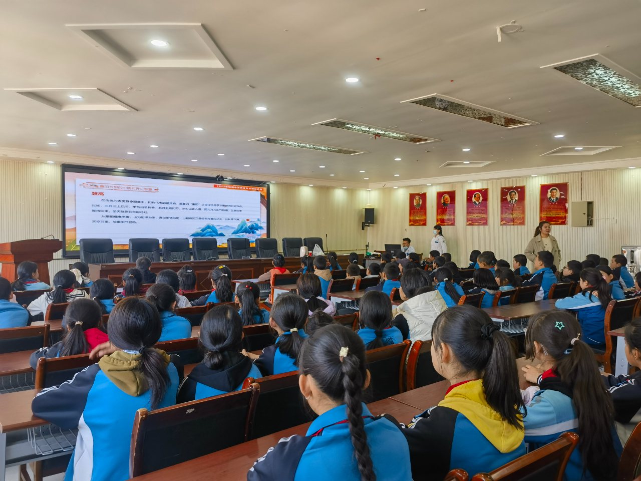学校老师以通俗有趣的语言,为同学们引入九九重阳节活动主题,向学生们介绍了重阳节的起源,讲解了敬老爱老、重阳赏菊、饮菊花酒、佩茱萸等节日习俗。化隆县中医院医务人员结合秋季气候特点,讲解秋季易出现的健康问题并播放中医小妙招,“灸童”与“药王”孙思邈对话主题视频。医务人员为同学们准备了百余个中药香囊,展示了药食两用茶饮,让同学们通过看一看、闻一闻、尝一尝,直观地感受中草药的外观及味道。医务人员们还为同学们普及了一些防病治病的中医小妙招。