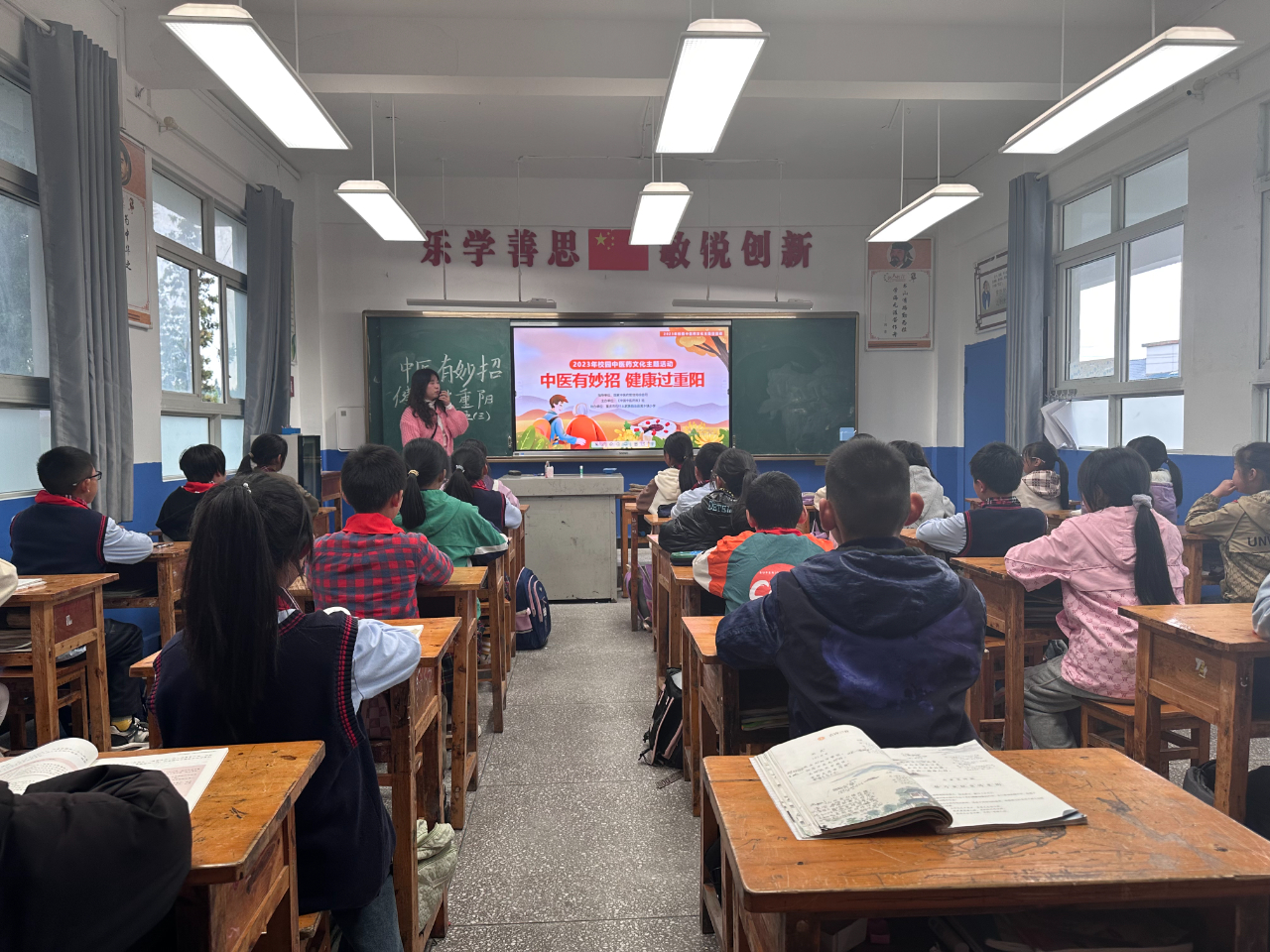 活动以班会的形式进行,全校14个班级全部参与主题活动。主题班会上, 老师们让孩子们了解了重阳节的起源、传统习俗等知识,懂得了重阳敬老的中华孝道文化及中医药敬老养生理念;孩子们通过观看中医药专家讲解视频,了解秋季易出现的健康问题,并学到了很实用的中医药小妙招。