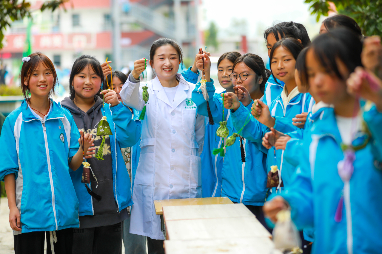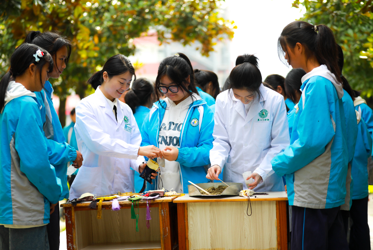 2023年10月23日,贵州省黔西市中医医院医护人员走进黔西市雨朵镇雨朵中学,开展“中药有妙招 健康过重阳”活动,活动中医护人员指导学生学习中医敬老养生、制作防疫香囊、配制菊花清新茶饮、现场学习穴位按摩、亲身体验中药制作等,为学生们带来趣味又实用的中医药文化科普知识。
