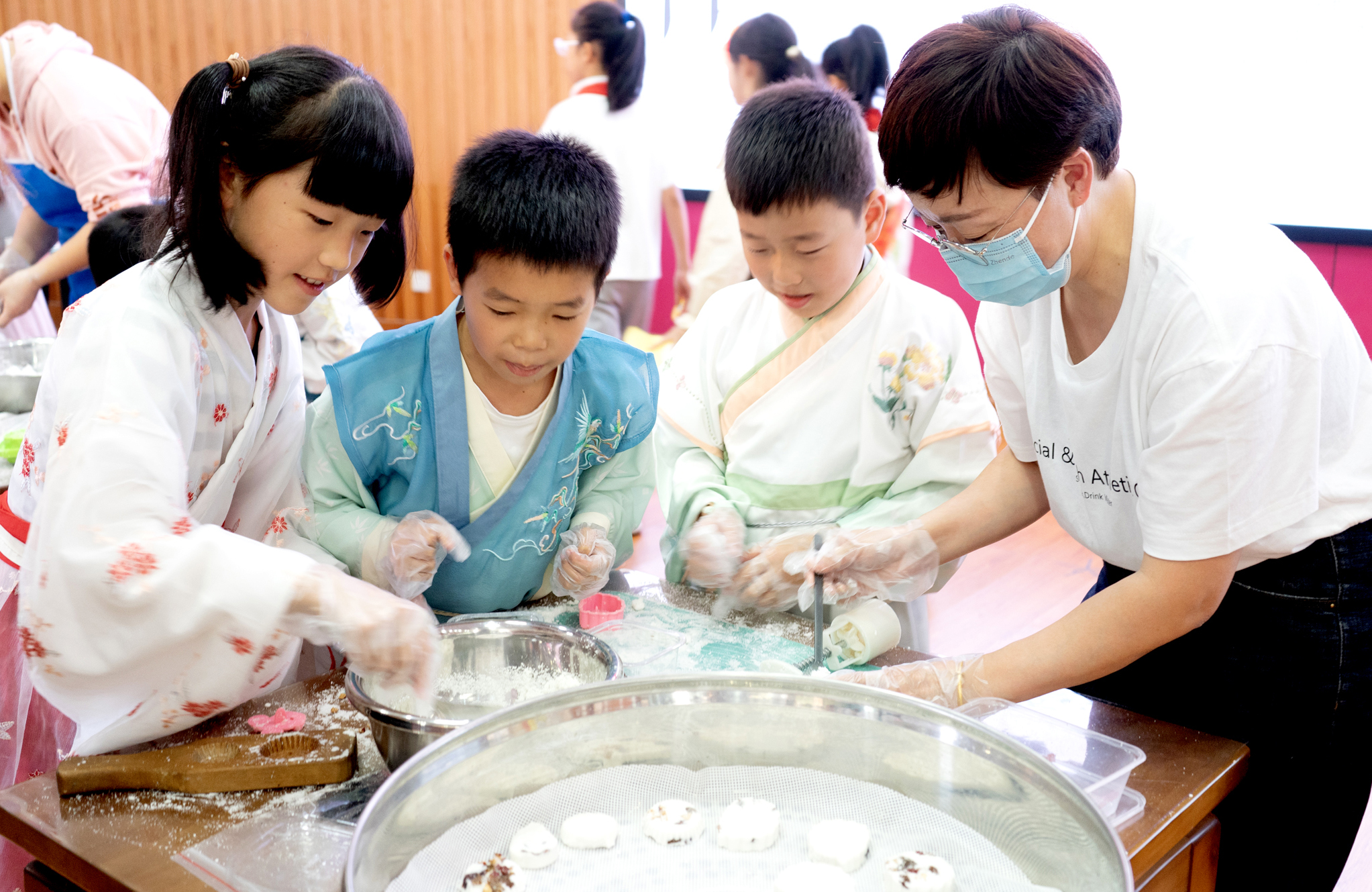 “中秋才过又重阳,又见花糕各处忙。面夹双层多枣粟,当筵题句傲刘郎。”在浙江省绍兴市秀水小学,重阳“集市”开张了。学生们现场制作重阳糕,将学到的中医知识运用其中,把祛痰止咳的桂花、健脾益胃的山药、利尿消肿的红豆、养血安神的红枣等分别加入食材中,揉、捏、筛、蒸、切……一整套操作在老师的协助下行云流水,花式各样、营养丰富的重阳糕制作完成。
