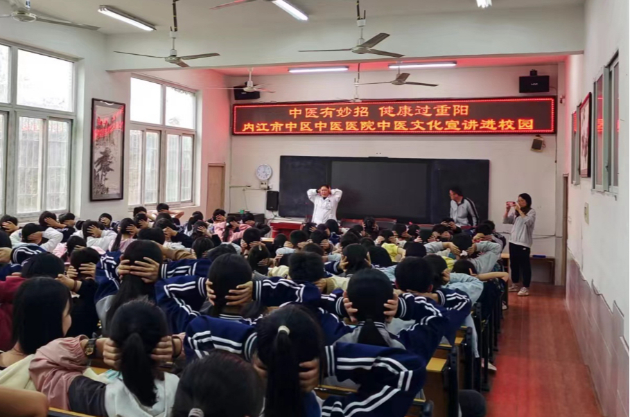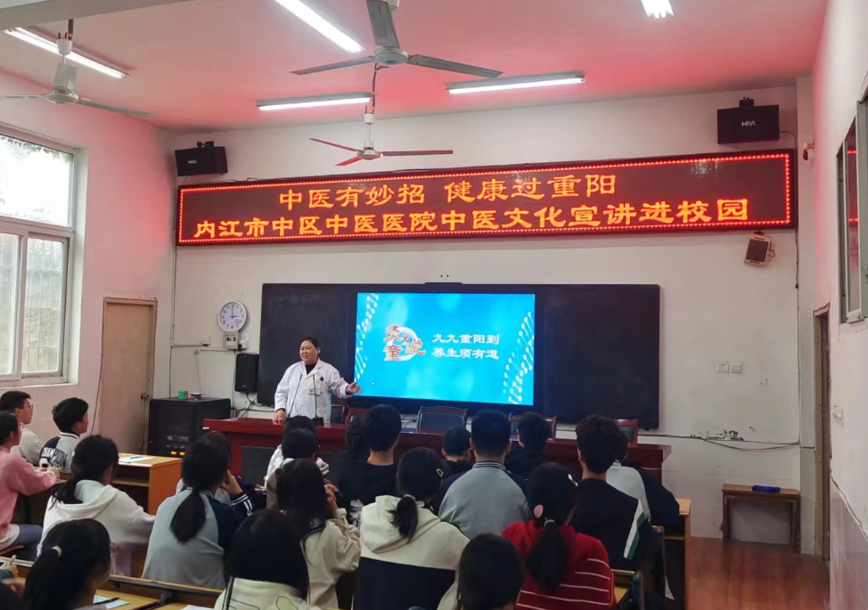 重阳节是最具中华传统民族文化氛围的一个节日,为了传承和弘扬中医药传统文化,普及中医药文化知识,让中华传统民族文化和中医药文化在青少年群体中生根发芽,2023年10月24日下午,四川省内江市市中区中医医院组织中医科专家到内江市第十一中学开展“中医有妙招 健康过重阳”2023年校园中医药文化主题日活动。
