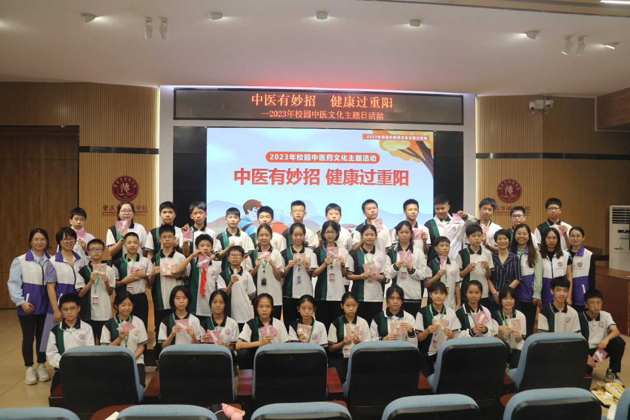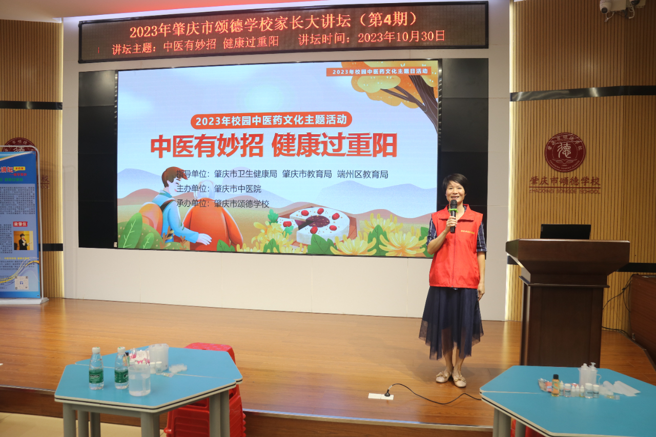在这秋高气爽、阳光明媚的金秋十月,广东省肇庆市中医药文化进校园活动第十一站于2023年10月30日下午走进了肇庆颂德学校,给师生们带来了一场生动有趣的校园中医药文化主题日活动。本次活动在国家中医药管理局的指导下,由《中国中医药报》社有限公司主办,主题为“中医有妙招 健康过重阳”。该院药学部彭爱娜副主任中药师担任活动讲师,医教部梁肇仪协助开展活动,颂德学校师生约150人参加。