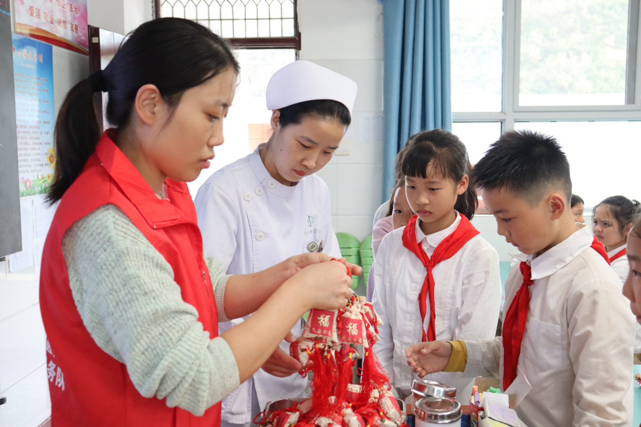 何护士长还介绍了中药香囊的分类、药粉制作及香囊的制作过程,医院医护徐萌、黄霞手把手带教小学生们现场制作中药香囊,一个个小巧玲珑的香囊制作完成了,孩子们看着自己的“作品”,脸上绽放着开心的笑容,在制作过程中,孩子们也了解到佩戴香囊,不但有装饰点缀之风,还能增强免疫力,预防感冒。