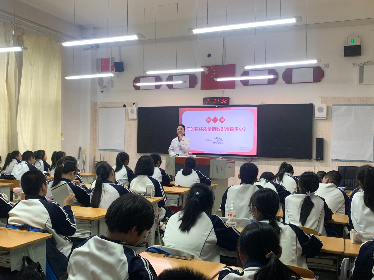 健康体重自测,评估健康状况。孟庆媛以“世界防治肥胖日”引出活动主题,讲解身体质量指数自测方法,展示儿童青少年超重和肥胖筛查 BMI 界限值,并播放中国科学院仝小林院士讲解的肥胖辨证分型体重知识视频。同学们积极参与自测,对自己的体重及健康状况有了更为深刻的了解和认知。