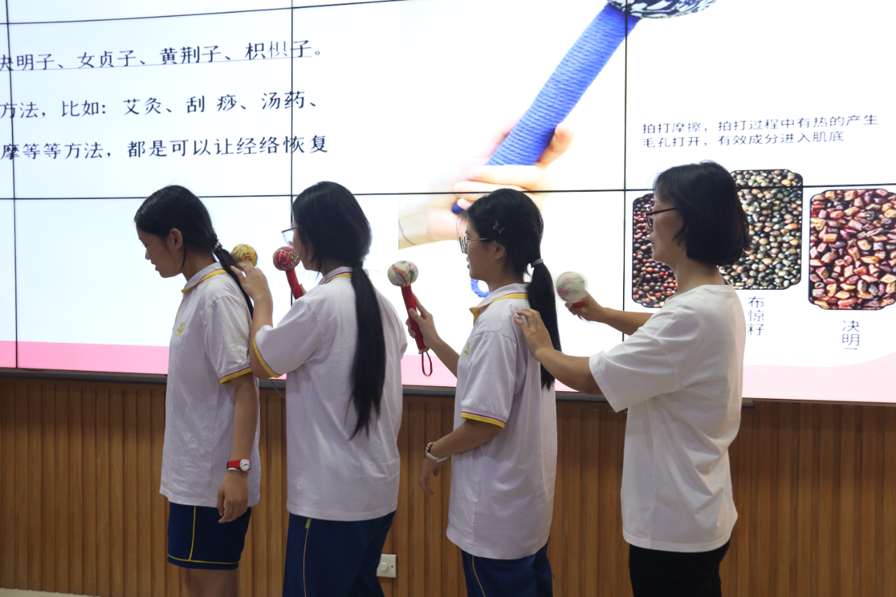 同学们认真听讲、积极互动,一起跳经络拍打操,课堂气氛热烈。