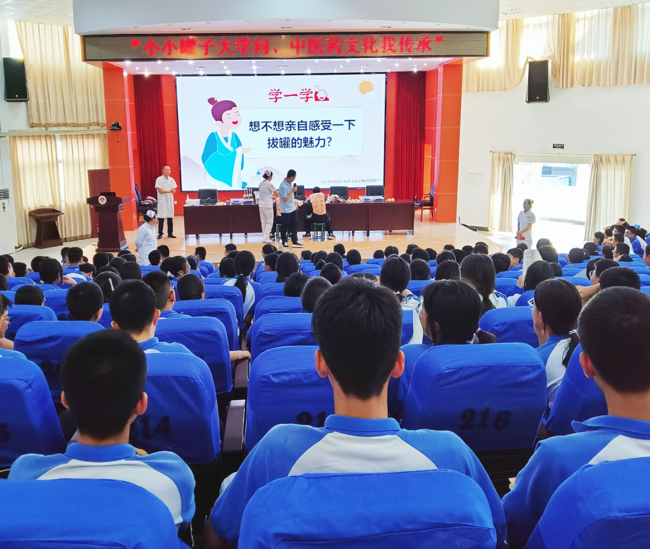 南江县中医医院康复专业岳鑫老师紧抓时事热点,以出现在奥运赛场运动员身上的“神秘东方力量”为切入点,为同学们详细讲解了拔罐的历史、作用原理、适应症及人体穴位等知识。通过问答竞赛的形式,同学们积极参与,热切的希望能上台体验拔罐疗法,零距离感受中医文化的魅力,把现场气氛推向了高潮。
