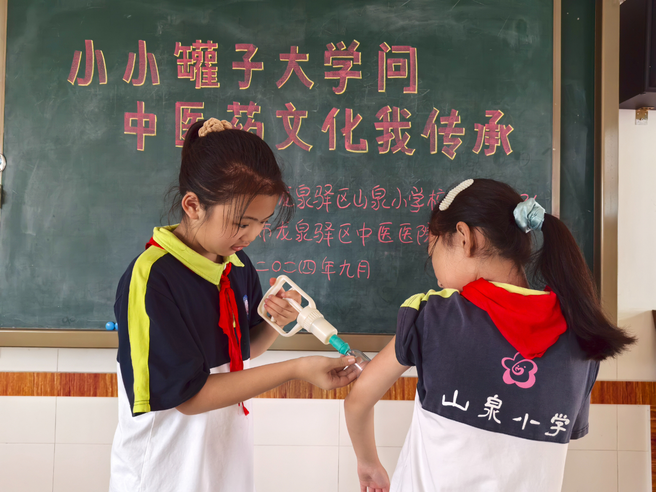 实践环节是本次活动的重头戏。龙泉驿区中医医院张老师现场为同学们演示了火罐疗法,详细讲解和示范了包括选罐、选穴、拔罐、起罐等步骤,张老师还教学生如何判断“罐印”不同颜色对应不同的身体情况。通过现场观摩,同学们不仅掌握了拔罐的基本技能,还深刻感受到了拔罐的魅力。最后,为了以后这项活动能继续深入持续开展,中医医院还赠送了一套拔罐材料给山泉小学,鼓励孩子们把这项中华民族传统医学继续传承下去。