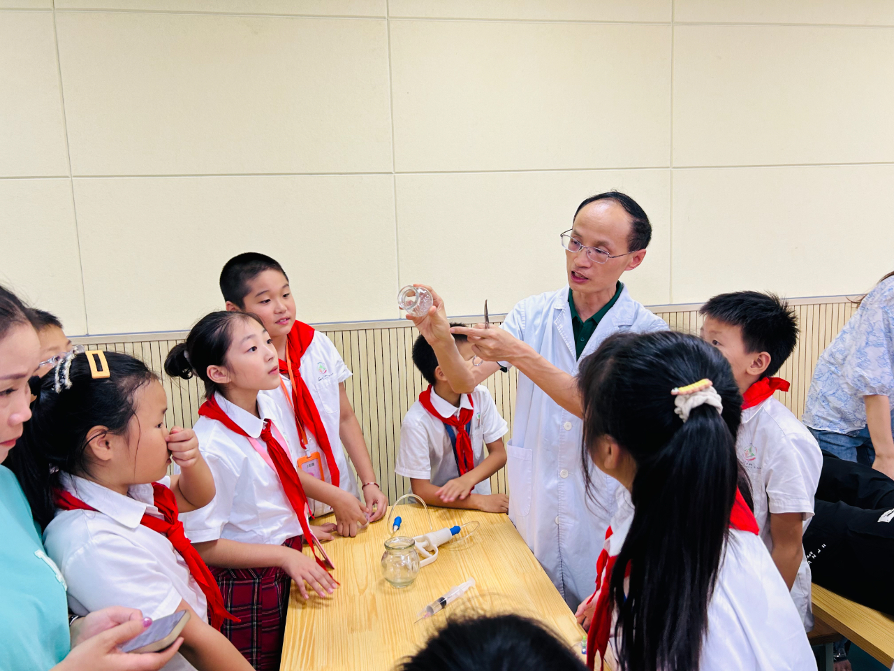 活动中,杜医生还进行了拔火罐的演示,由一名家长配合示范。在演示过程中,详细展示了火罐疗法的基本操作步骤,包括选材、预热、拔罐手法等。